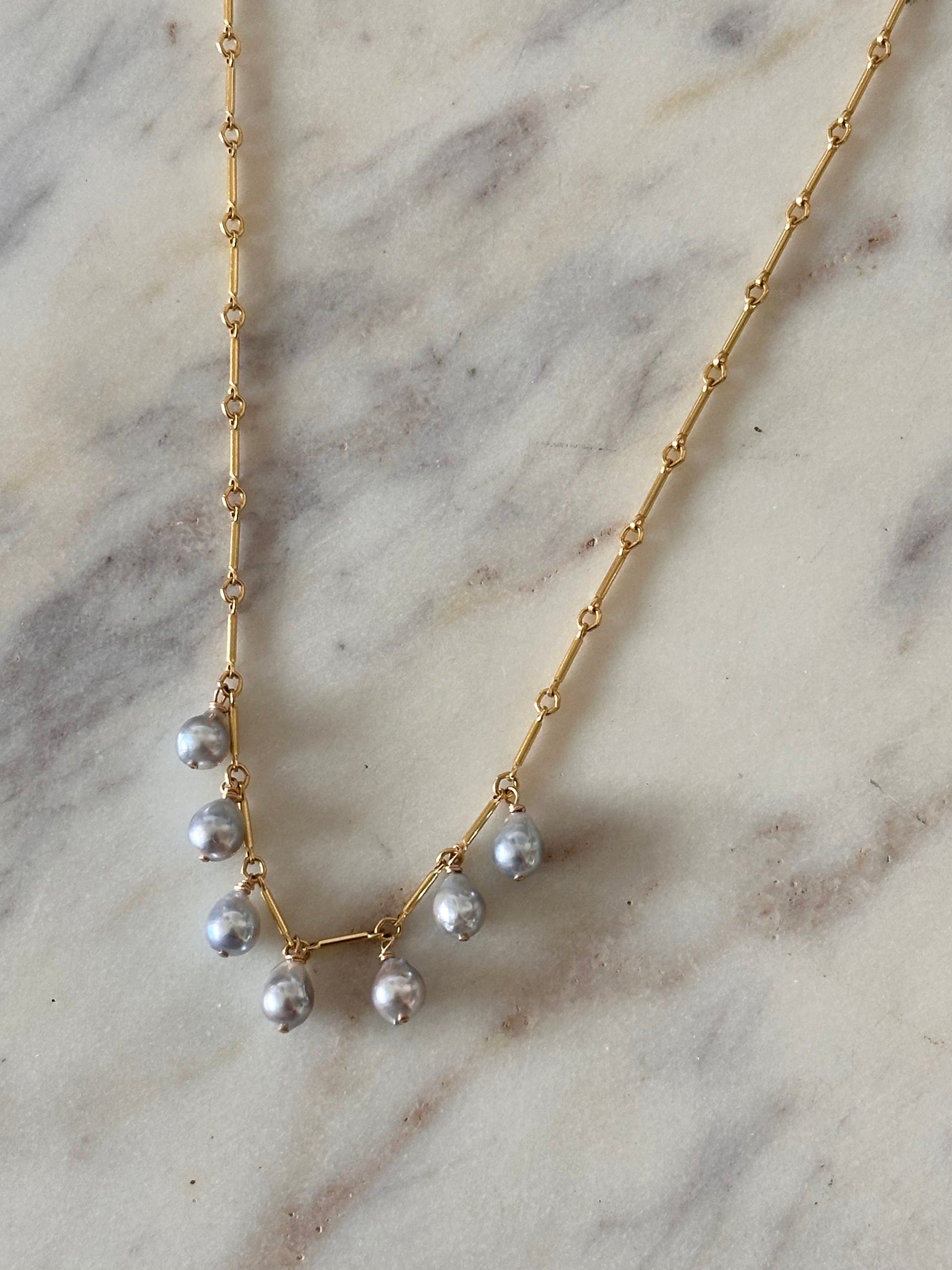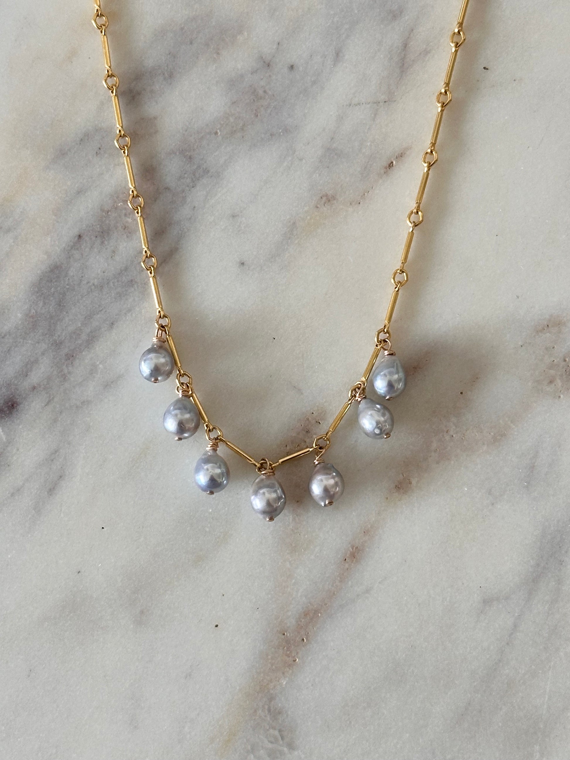 Like tiny drops of ocean light—this necklace features rare, natural blue Akoya pearls that shimmer with soft luster and effortless elegance. Wirewrapped on a delicate 14k gold-filled chain, each pearl is handpicked for its one-of-a-kind beauty.