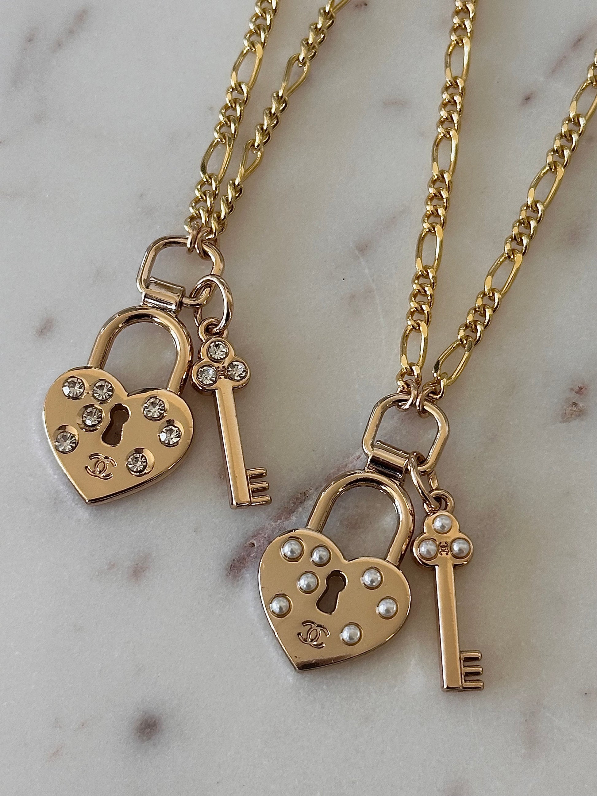 These repurposed Chanel necklaces are a perfect mix of vintage allure and modern romance. Each piece features a bold, gold chain paired with a heart-shaped padlock, symbolizing secrets kept close and stories untold. One lock dazzles with radiant rhinestones, while the other glows softly with delicate pearls both crowned with the subtle elegance of the iconic Chanel logo beneath the keyhole.