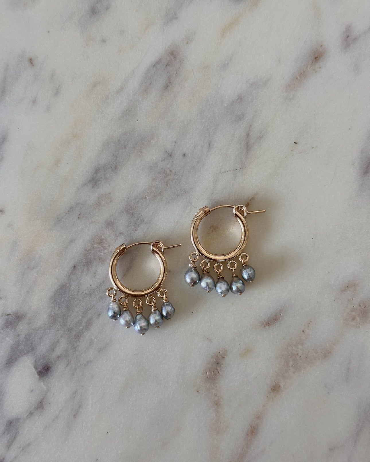 Golden hour in earring form — these mini hoops are handmade with 14k gold-filled hoops and dripping in rare blue Akoya pearls. Each luminous pearl dances with every step. Lightweight, effortless, and made to shine from beach strolls to golden hour drinks.