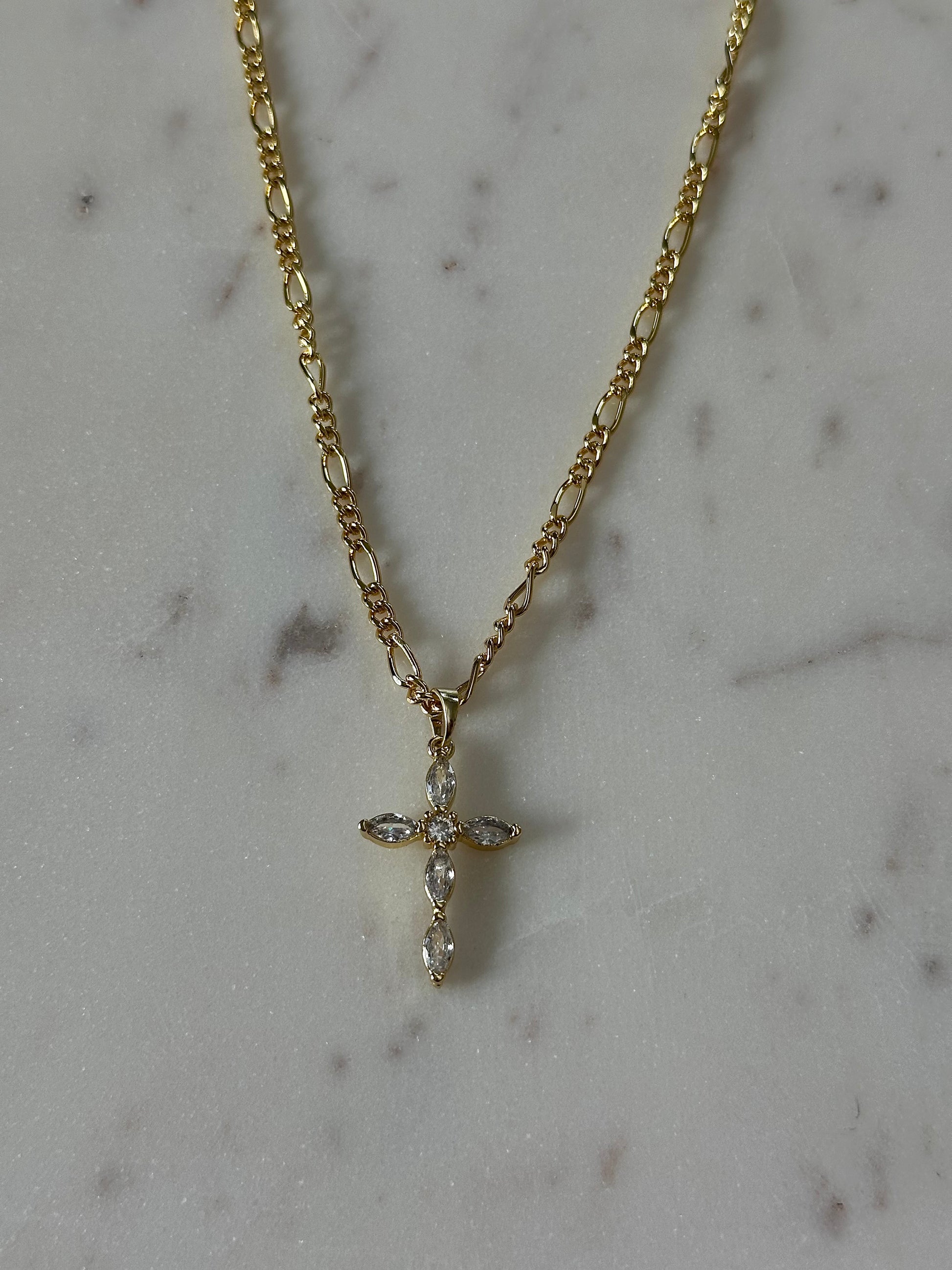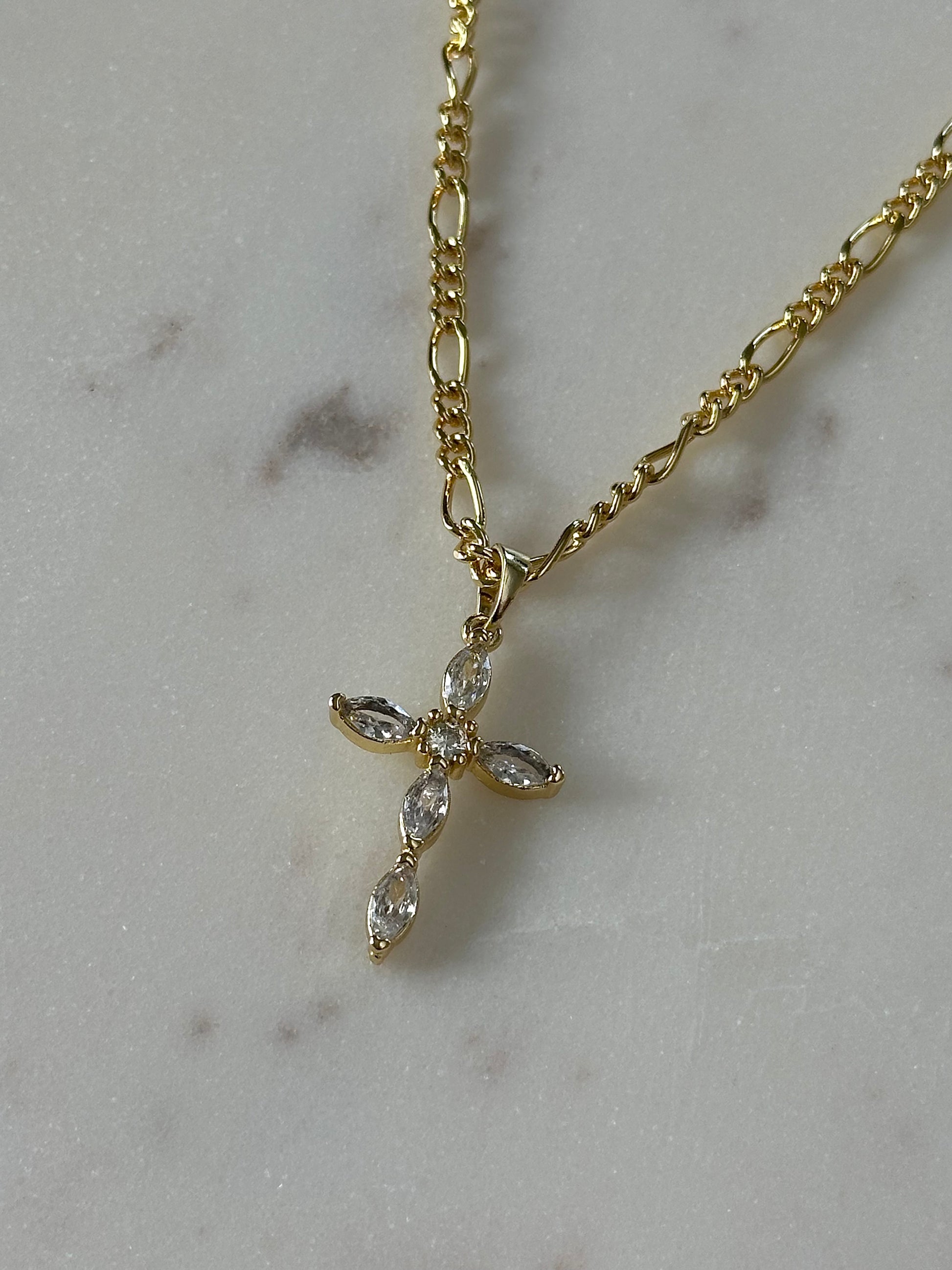 Add a touch of elegance to your wardrobe with the Evangeline Cross Necklace. This stunning necklace features a statement cz pendant that shines with every movement.