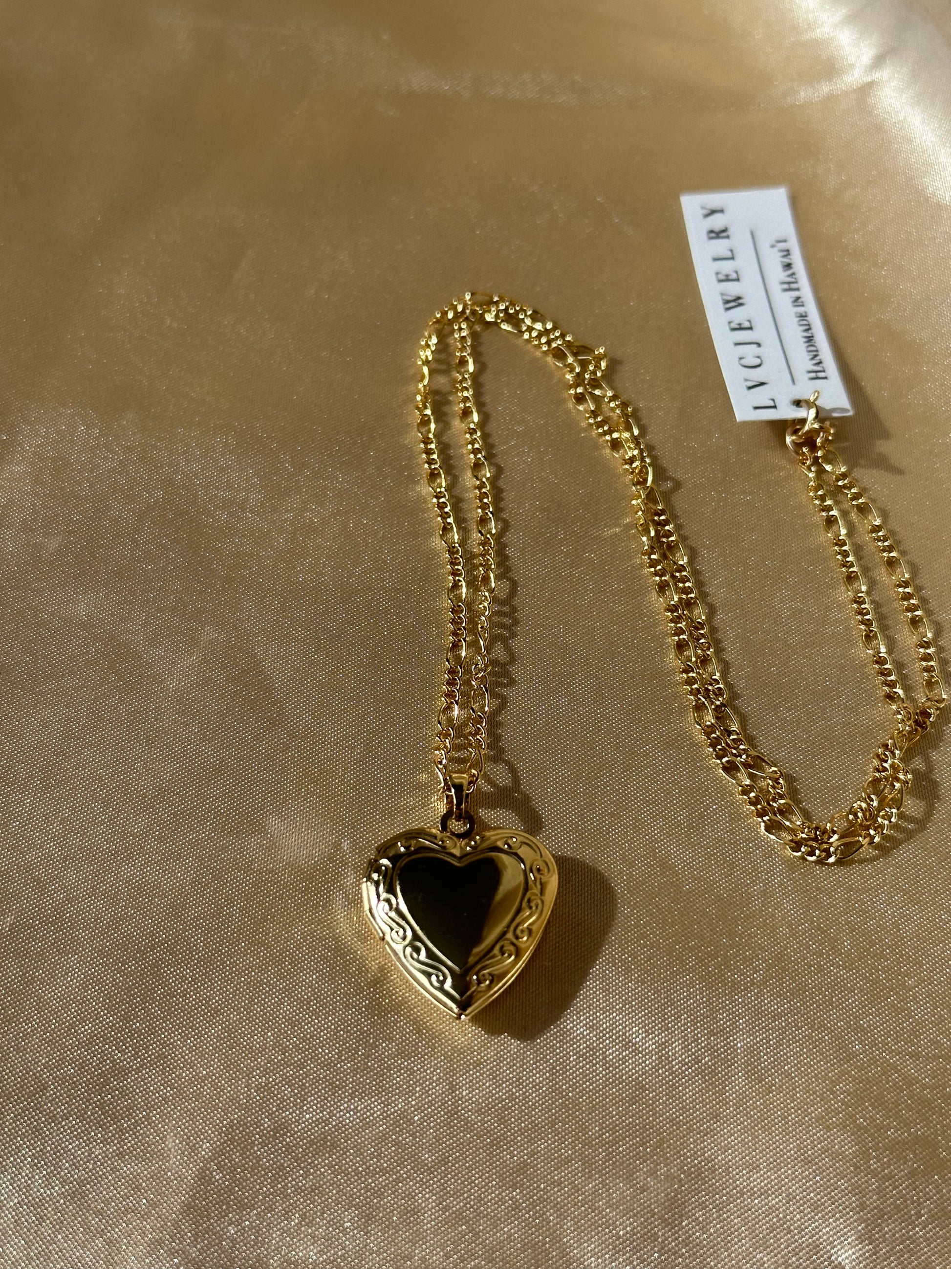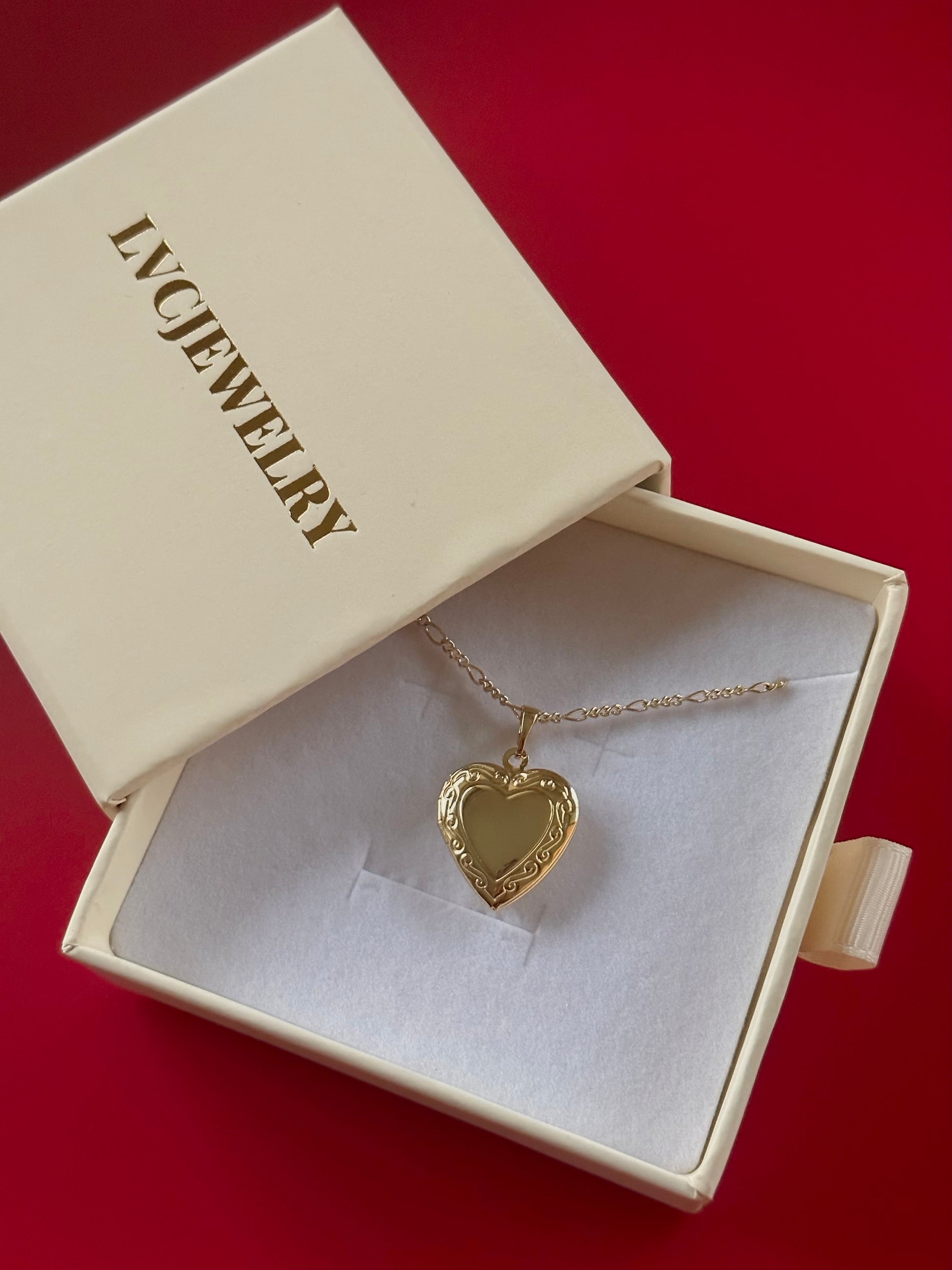 This gold heart locket on a figaro chain is a timeless accessory that adds a touch of elegance to any outfit. The locket allows you to keep a photo or small memento close to your heart, making it both fashionable and sentimental.