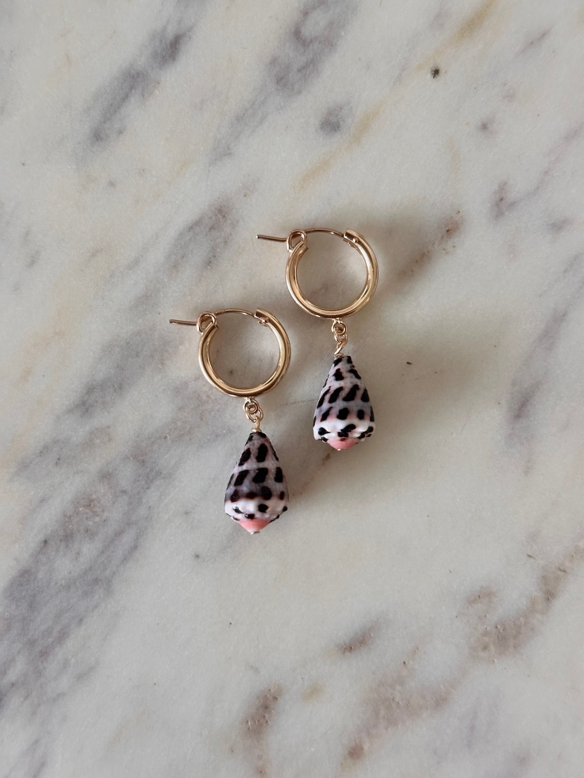 A little wild, a little luxe—these huggies feature real Hebrew shells collected in Hawai‘i, each one completely unique. Their naturally spotted pink and black patterns bring bold island energy to these lightweight gold-filled hoops.