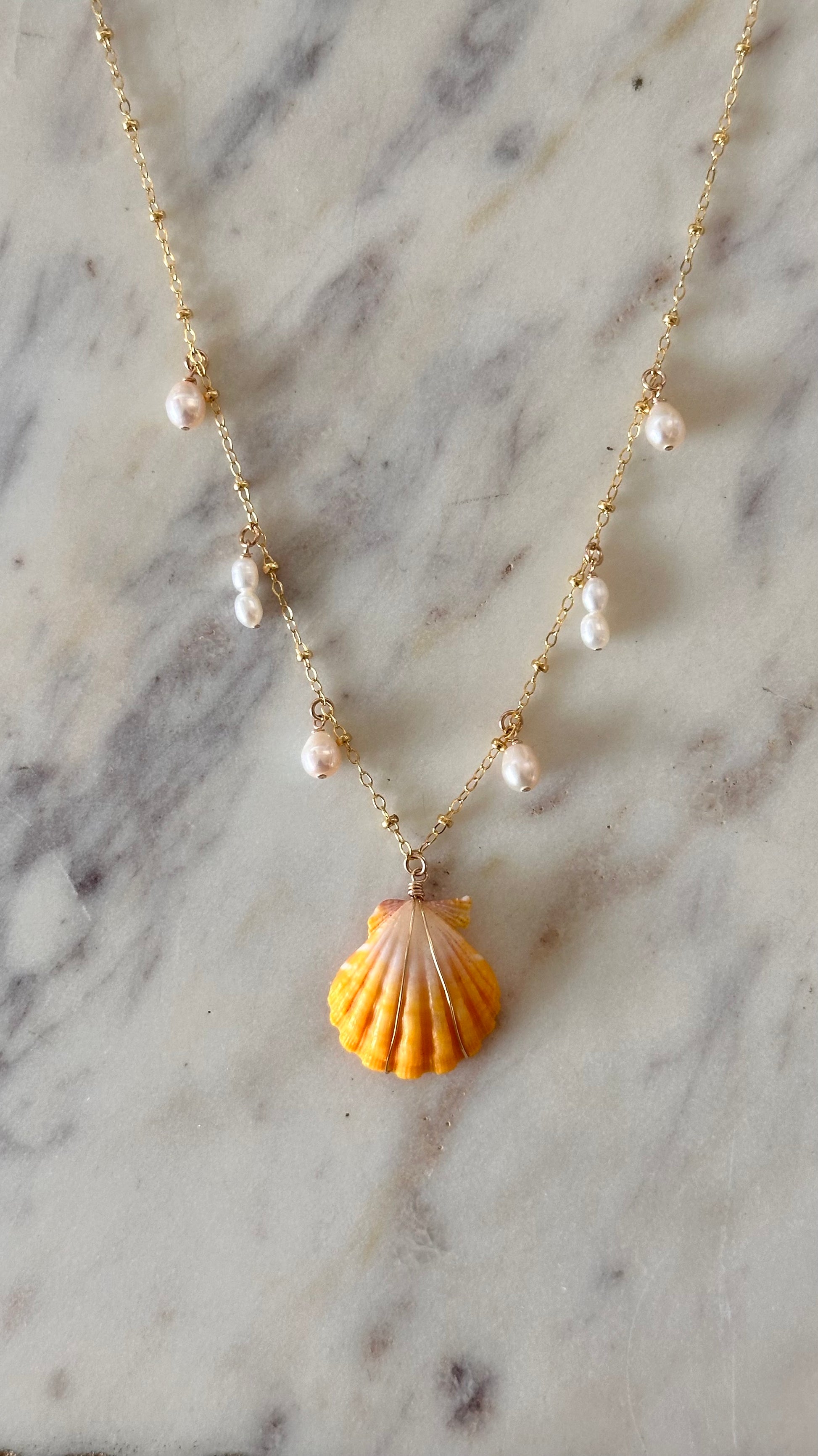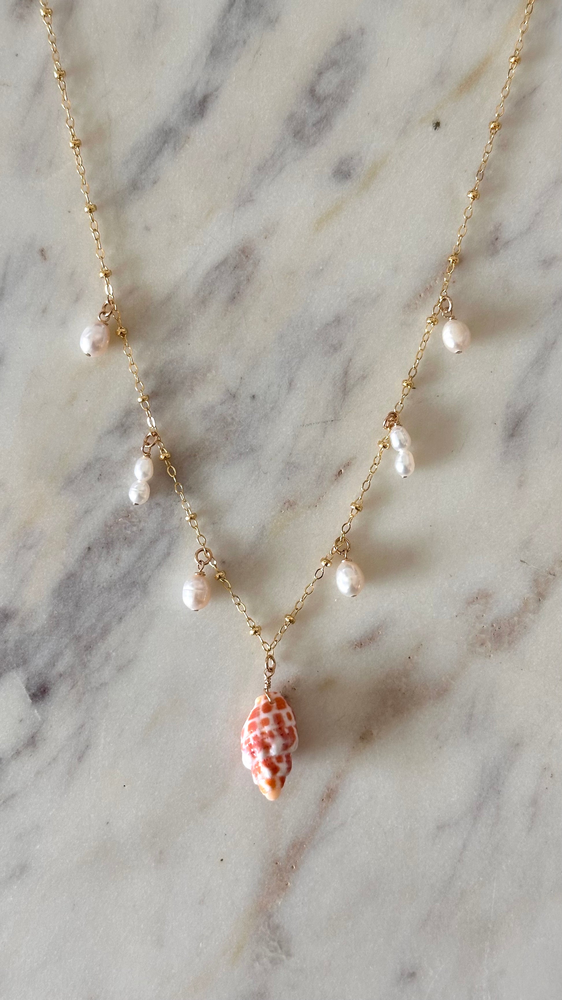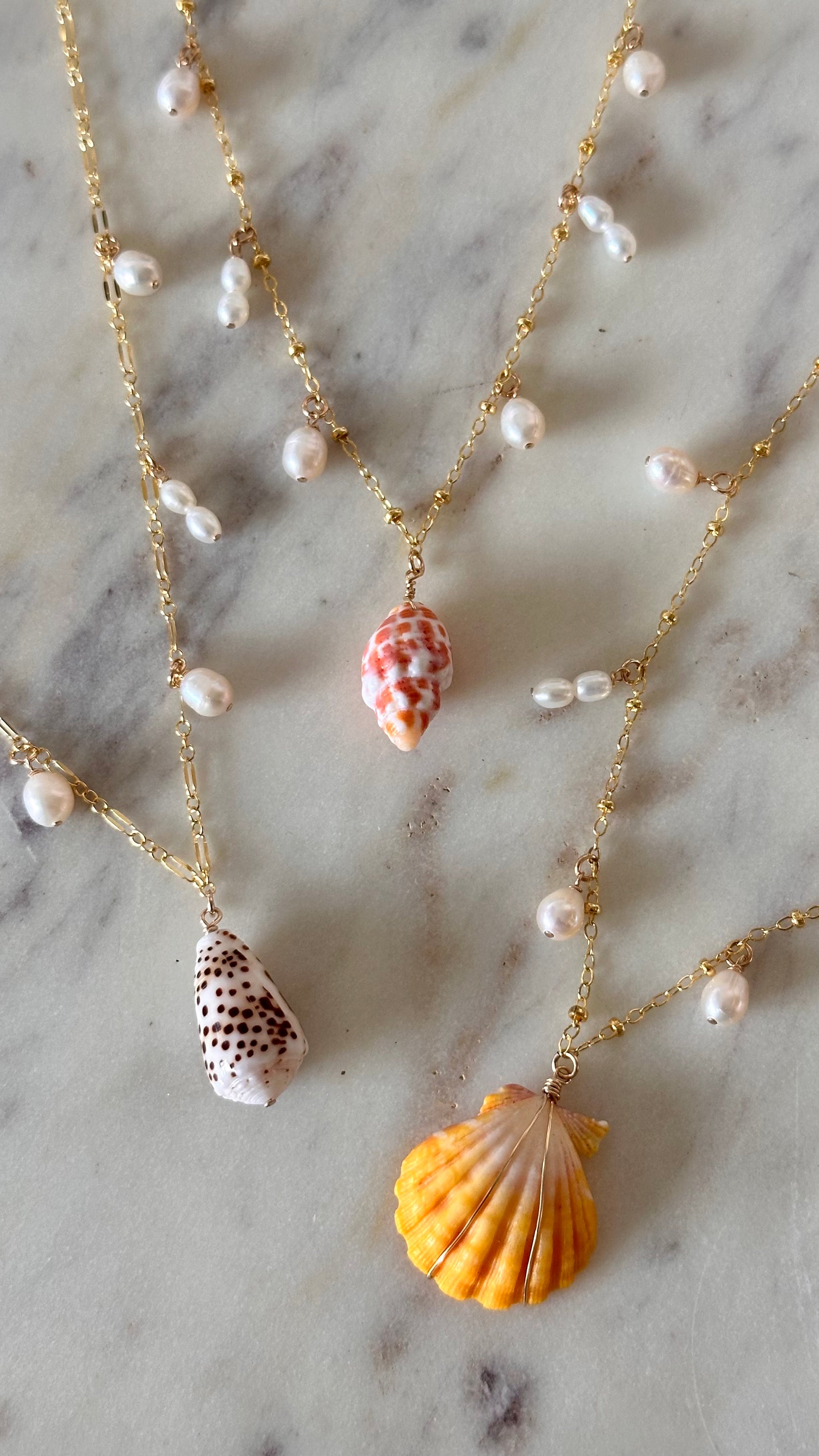 Golden days, salty skin, and a little piece of the island to wear every day. Each necklace is handmade with a one-of-a-kind Hawaiian shell paired with white freshwater pearls wirewrapped on 14k gold-filled chain that won’t fade. Ocean treasures made to layer, love, and live in.