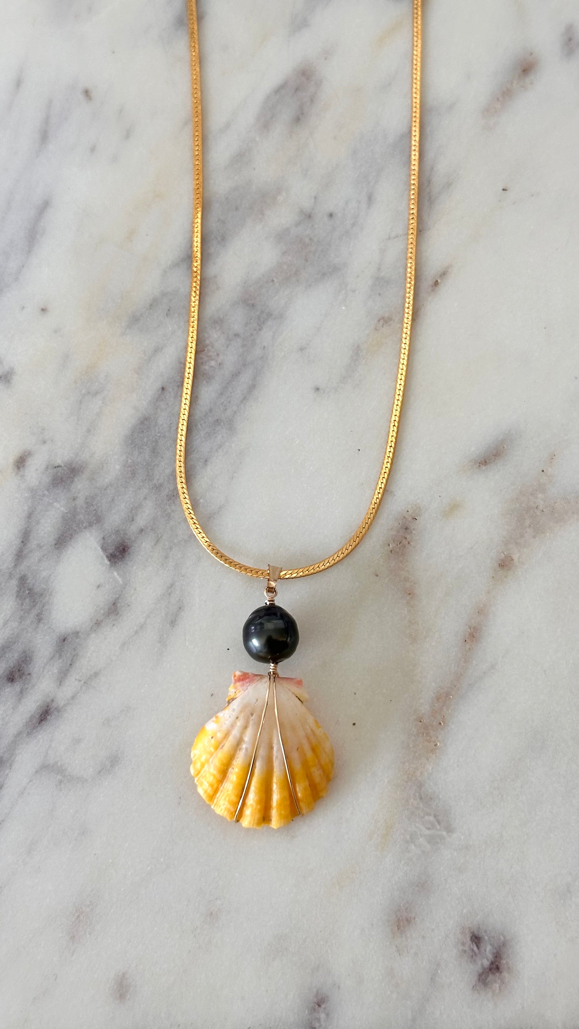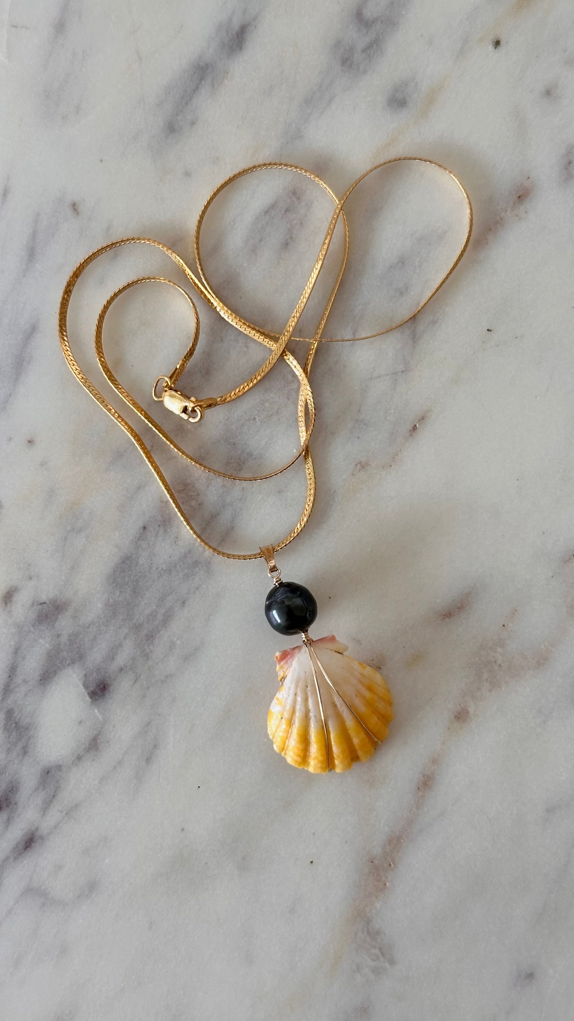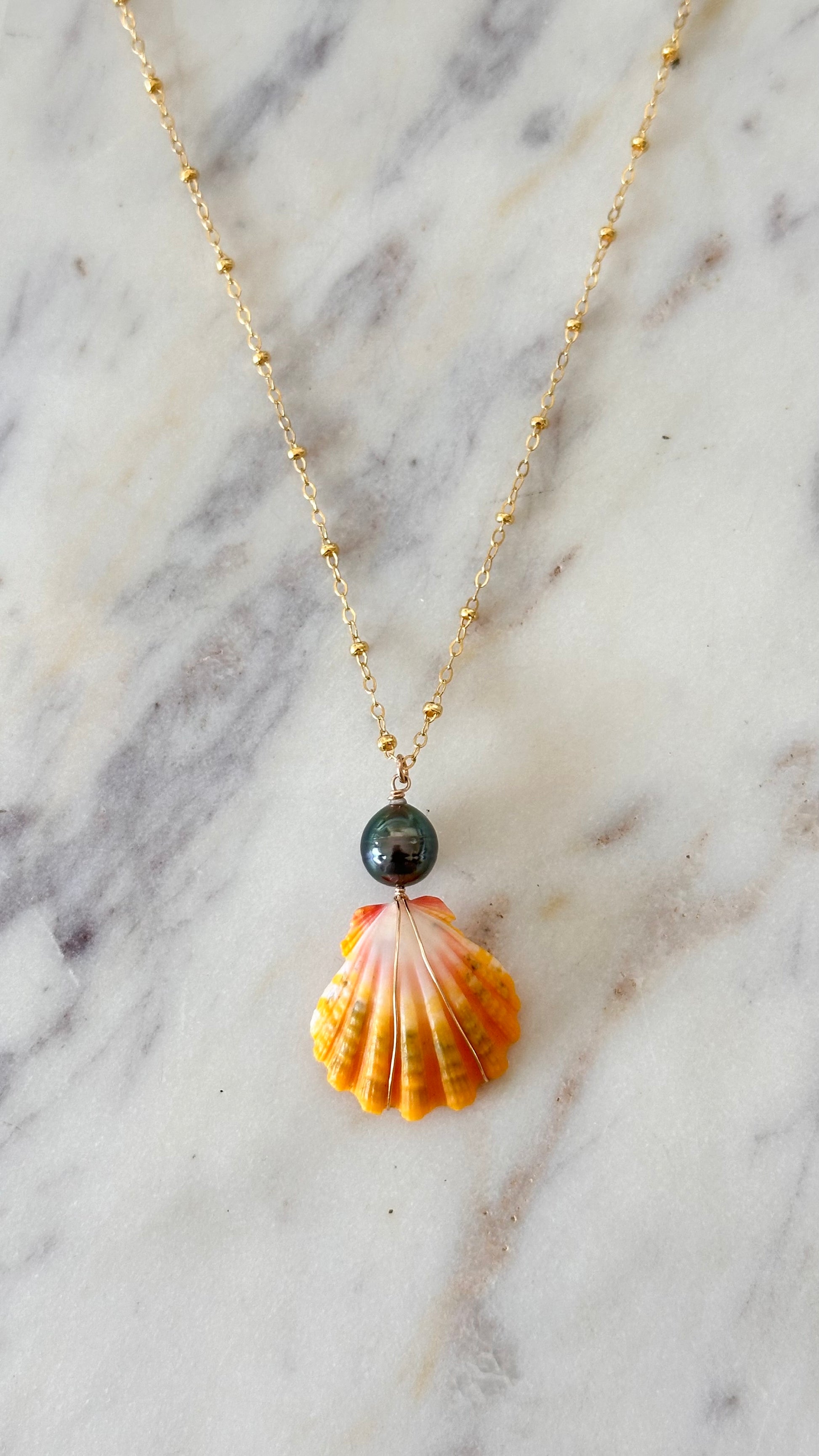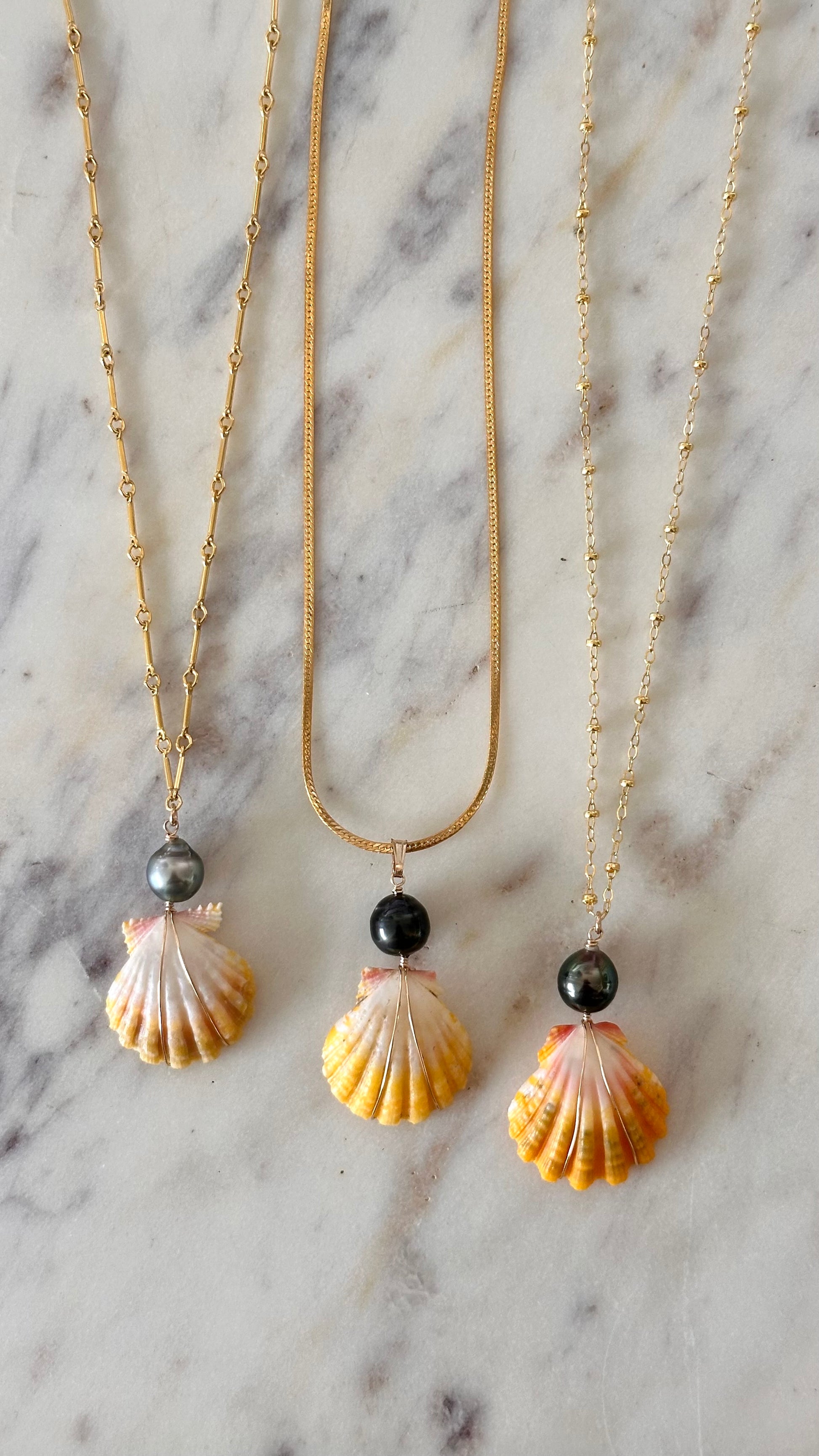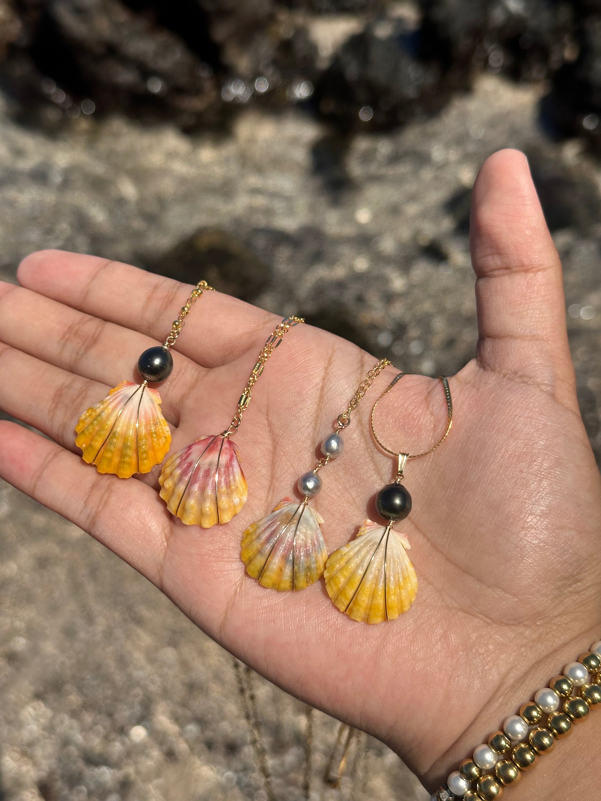 Handmade with genuine Hawai’i Sunrise shells and lustrous Tahitian pearls! The shells are naturally ocean-tumbled and paired with authentic and lustrous Tahitian pearls—suspended on 14k gold-filled chains for lasting shine. Inspired by slow island days and salty air, this piece brings a touch of coastal magic to your everyday.