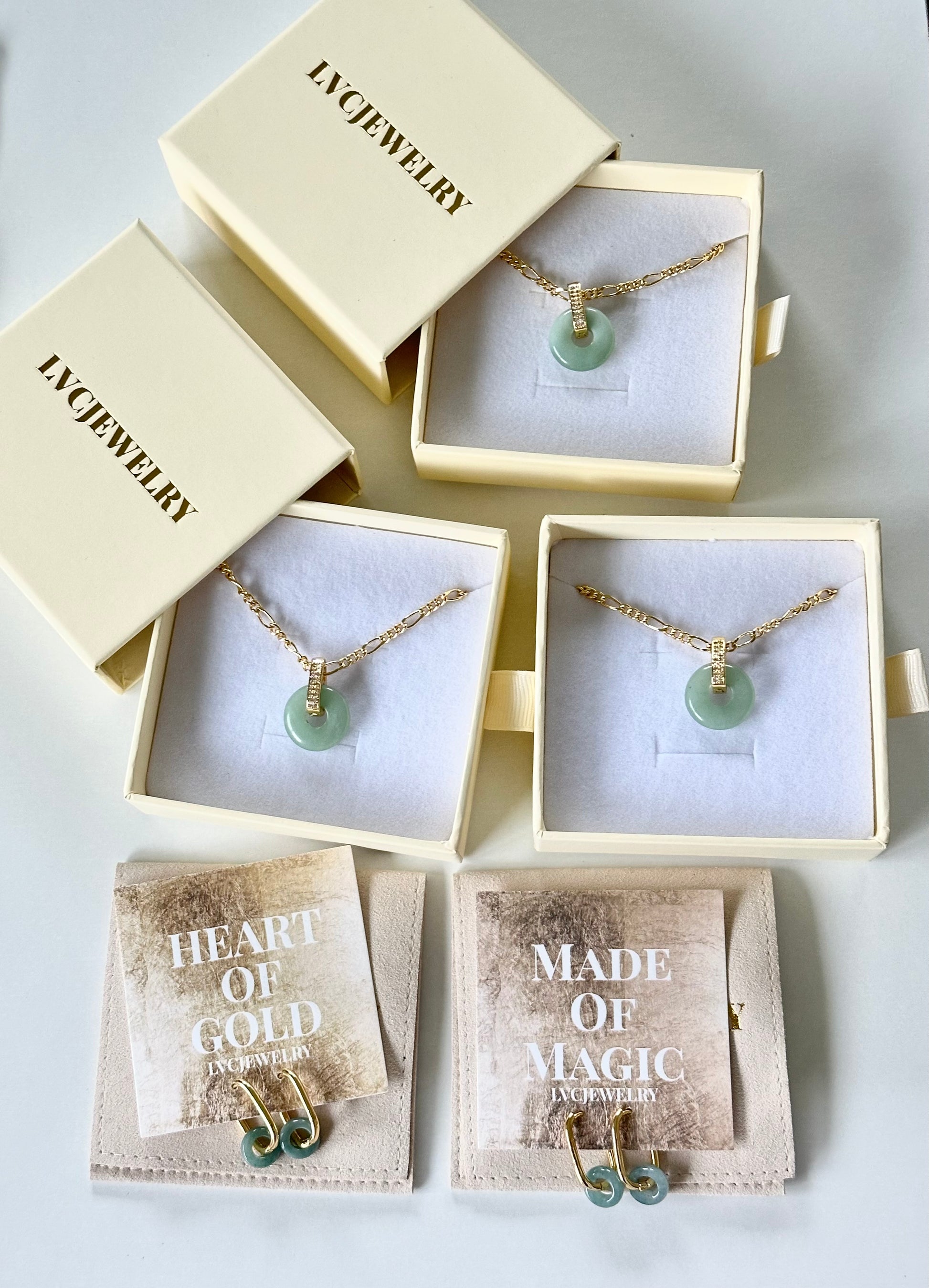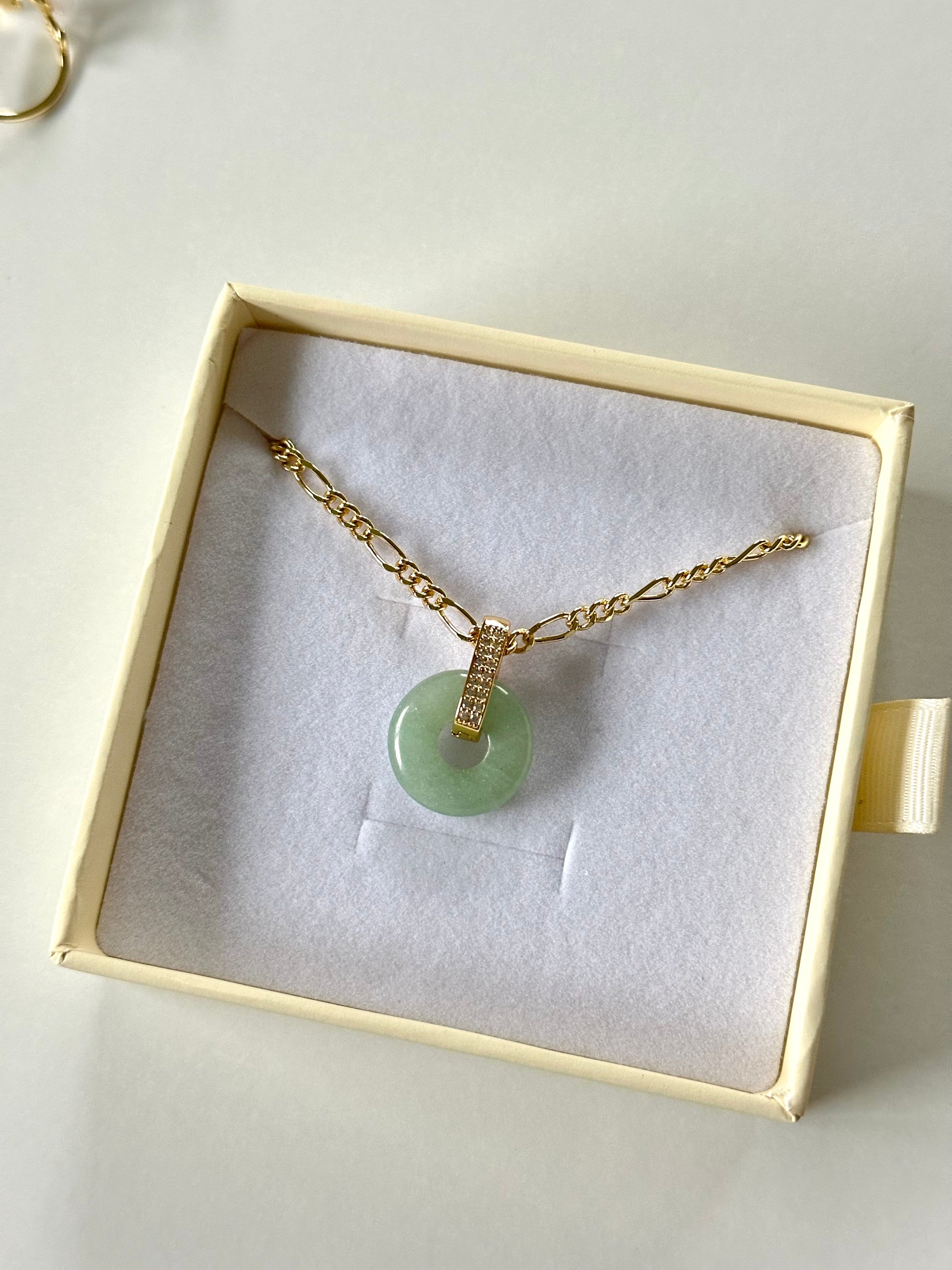 Elevate your style with our stunning Jade Donut Necklace. The smooth, polished jade donut pendant hangs delicately from a gold figaro chain, exuding elegance and charm. Upgrade any outfit and harness the calming energy of jade with this timeless accessory.