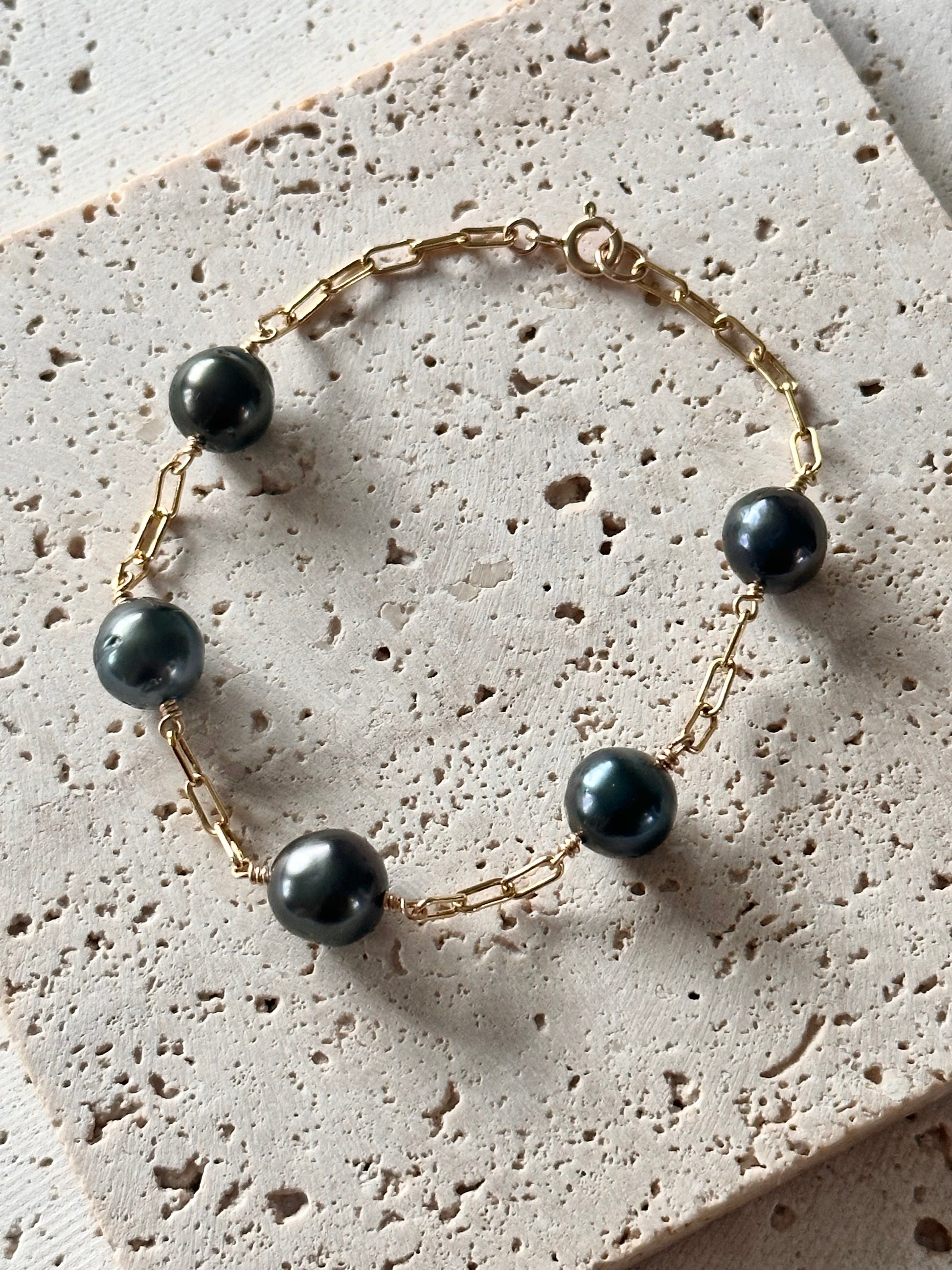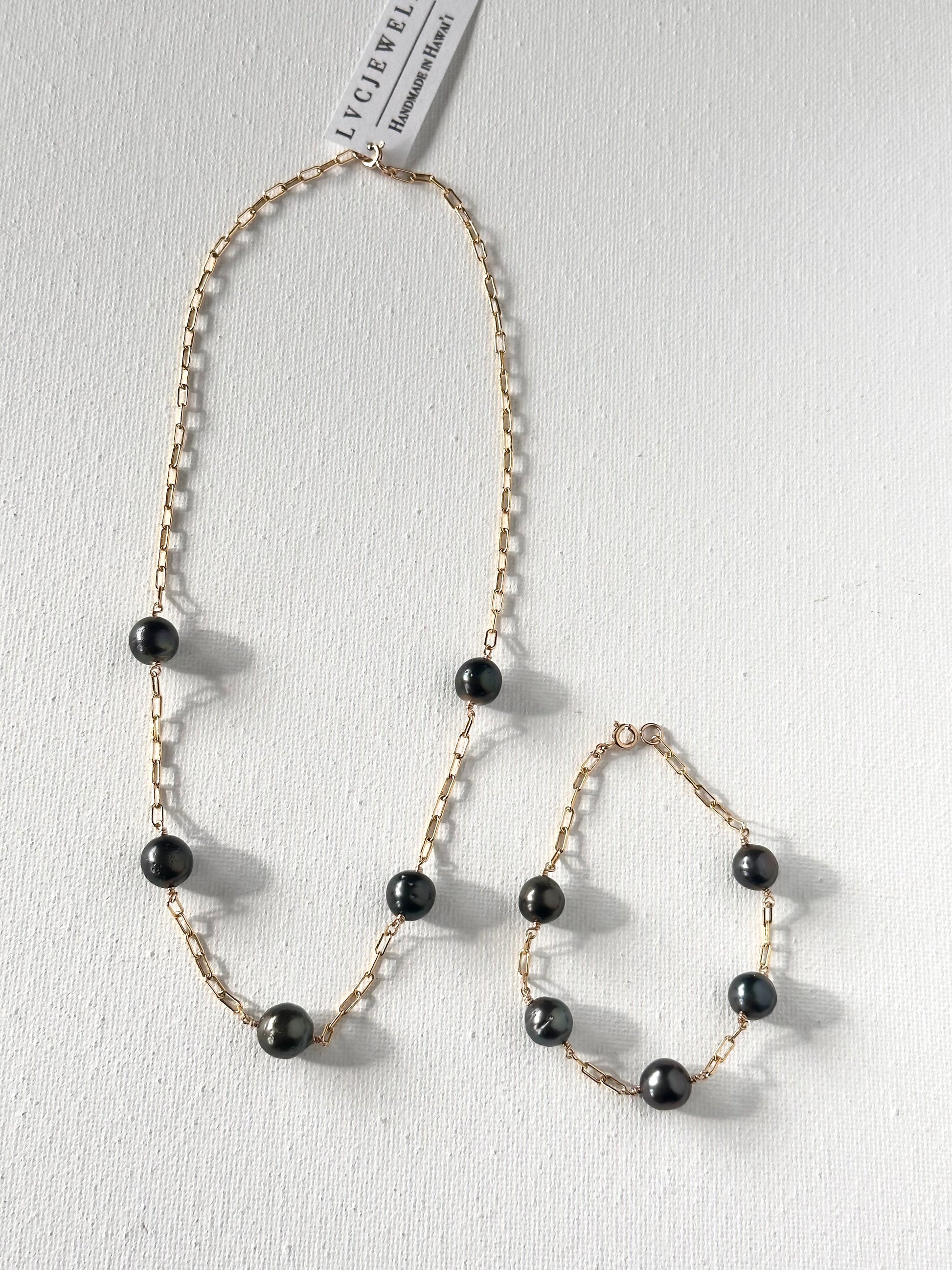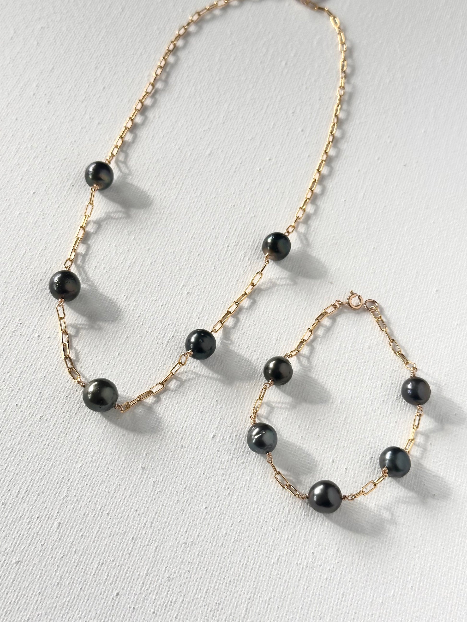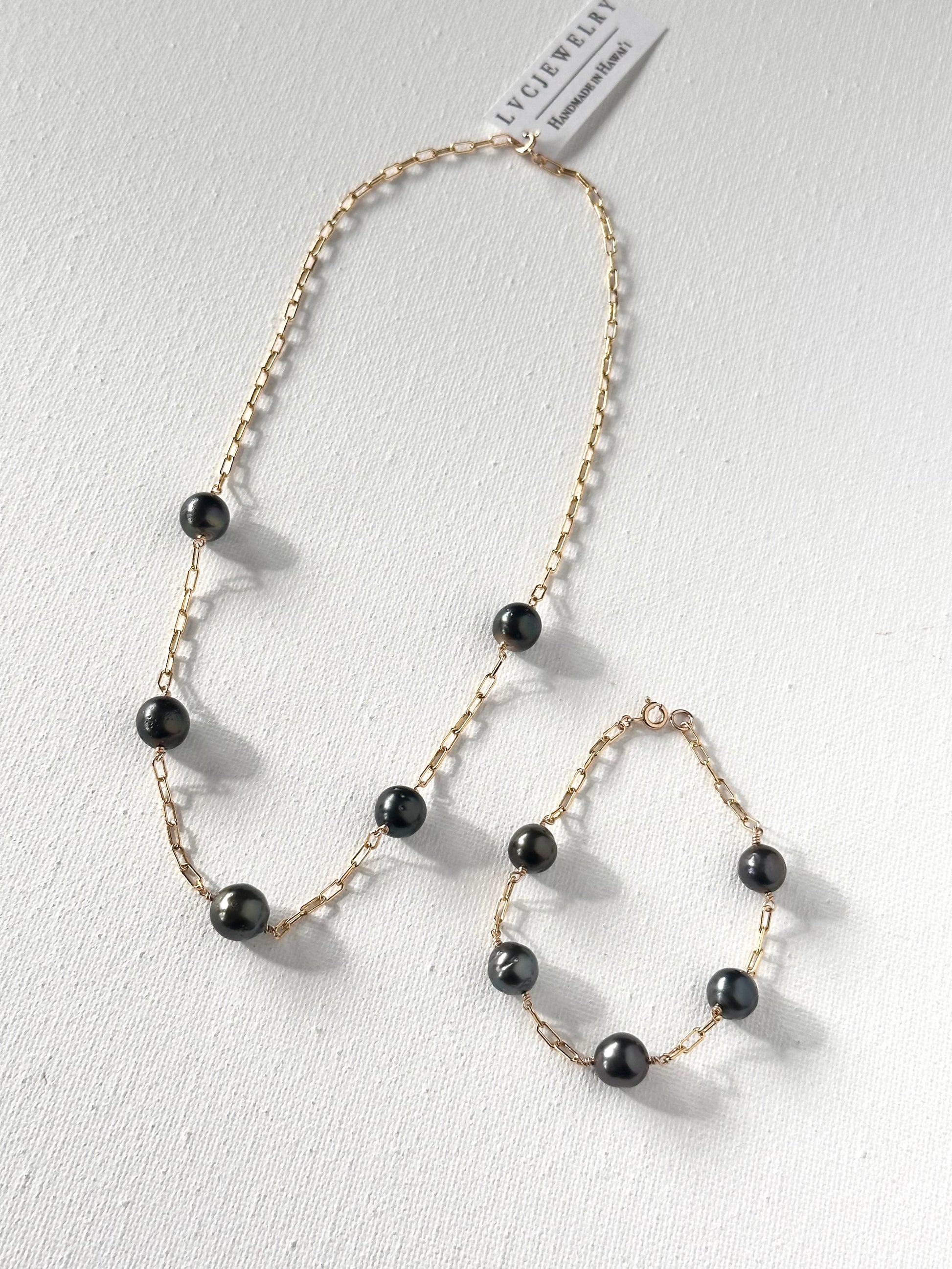 Experience luxury and elegance with our Leilani Tahitian Necklace and Bracelet set. Each piece features 5 exquisite Tahitian pearls, hand wirewrapped onto a 14kgf paperclip chain, creating a stunning and unique design. Elevate any outfit with this high-quality, luxurious set.