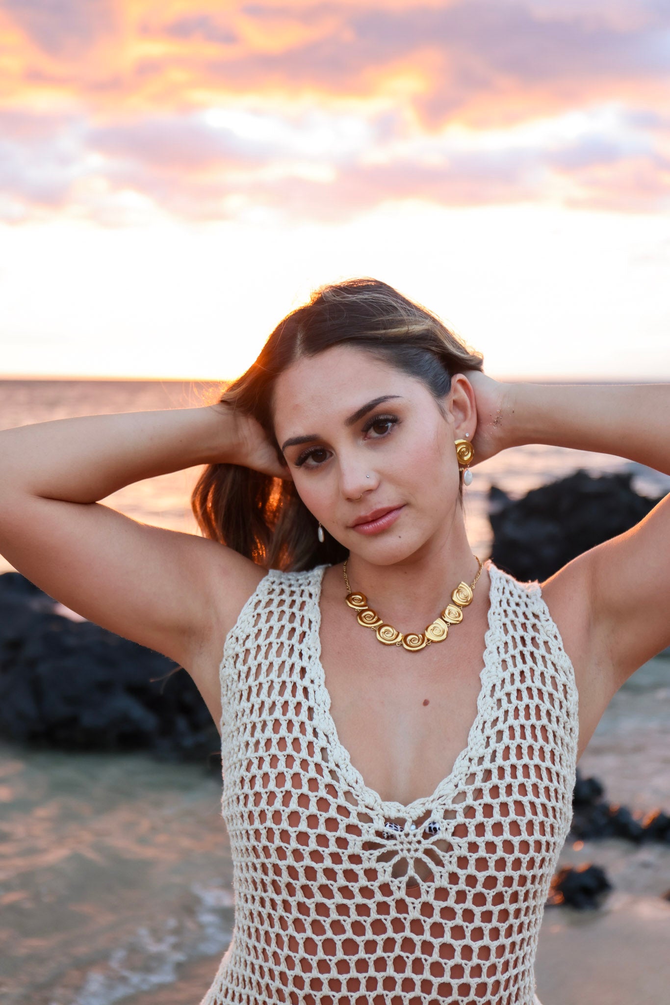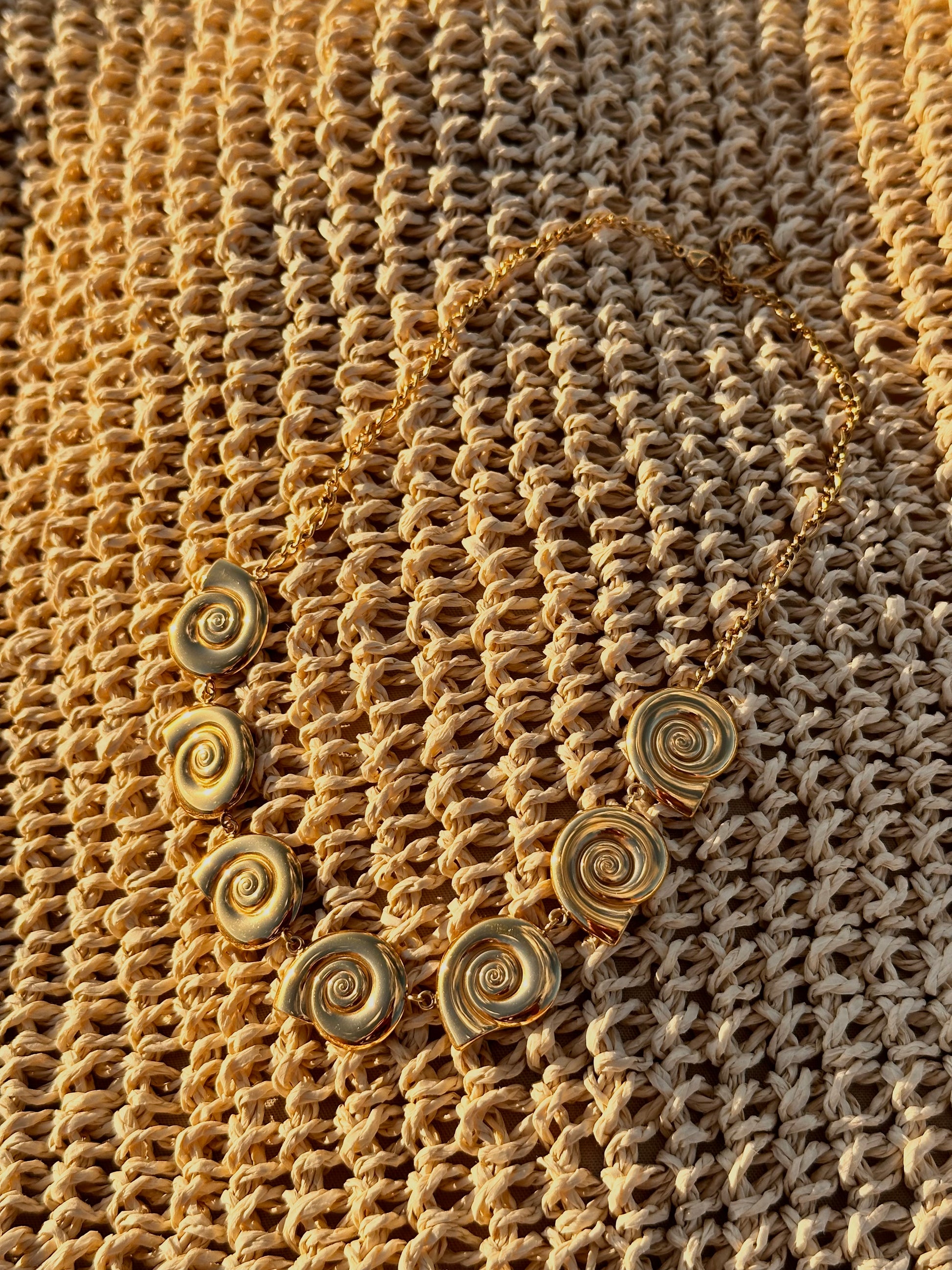 Channel your inner mermaid with the Mykonos Choker! This statement piece combines the elegance of a gold necklace with the playfulness! Adorned with a 7 nautilus pendants paired with a thicker style figaro chain.