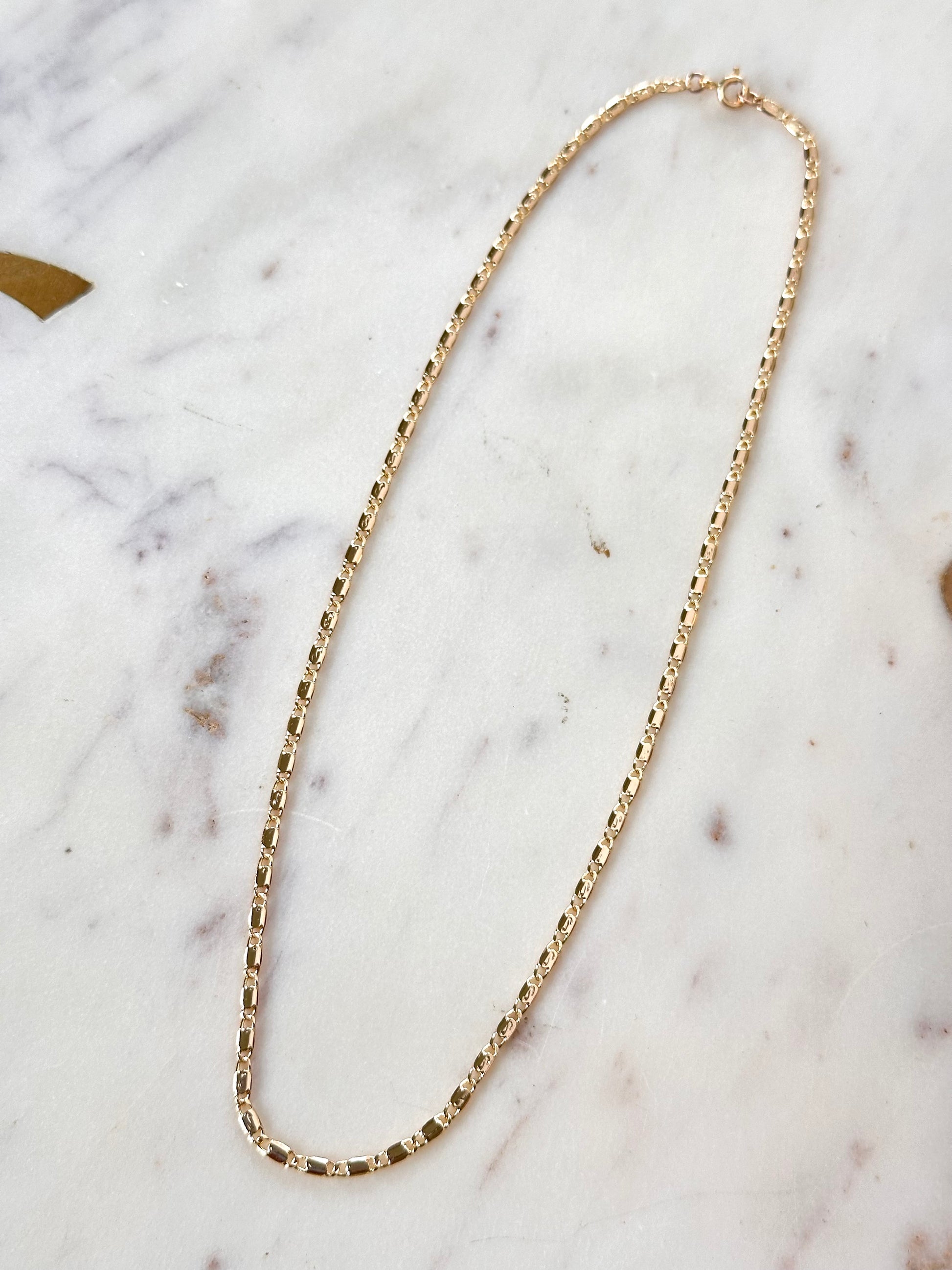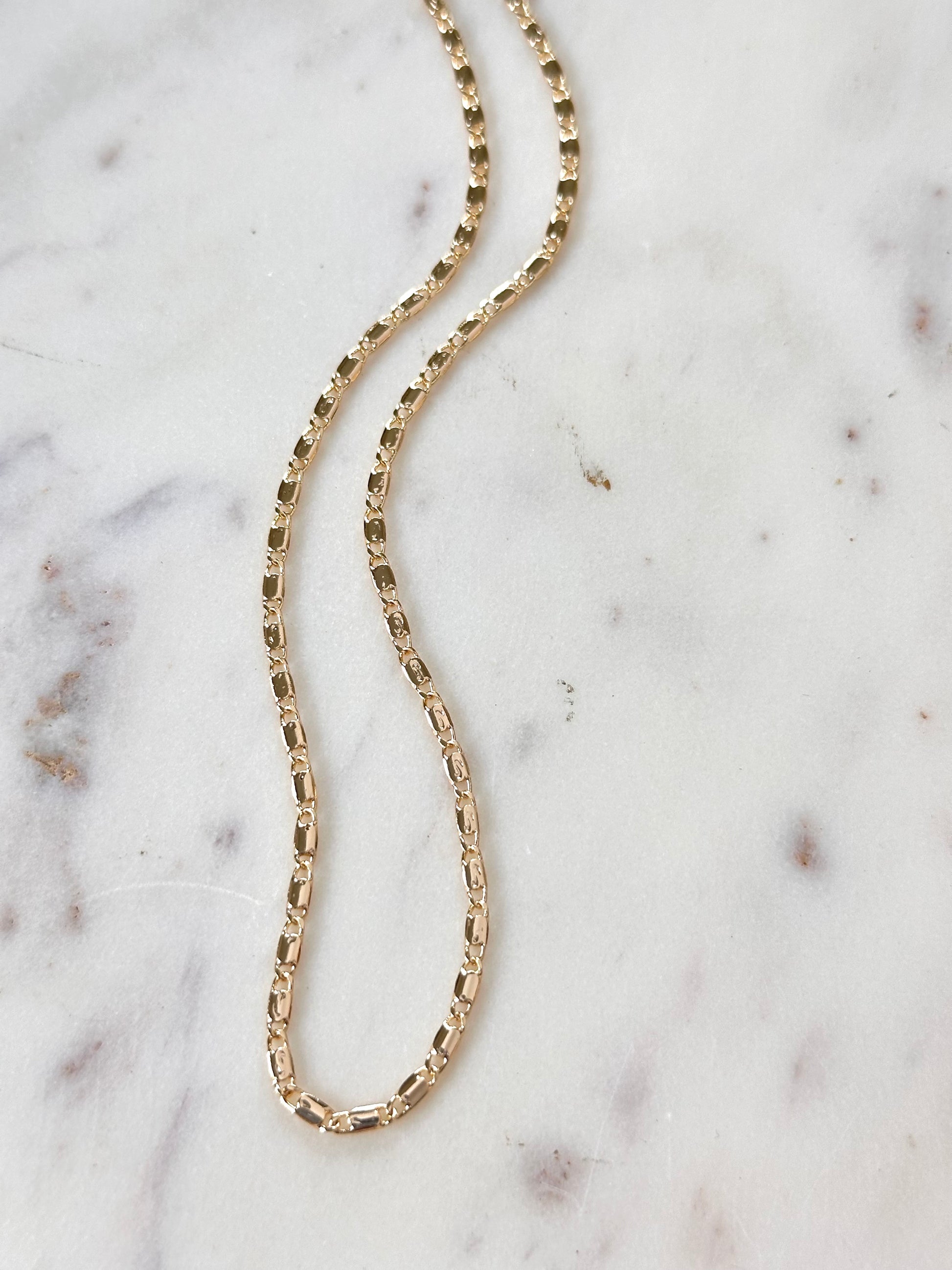 Introducing the Palma Chain Necklace - a sleek and classic piece with a golden flat bar design. This shiny necklace is perfect for adding a touch of flair to any outfit, making you look and feel effortlessly stylish.