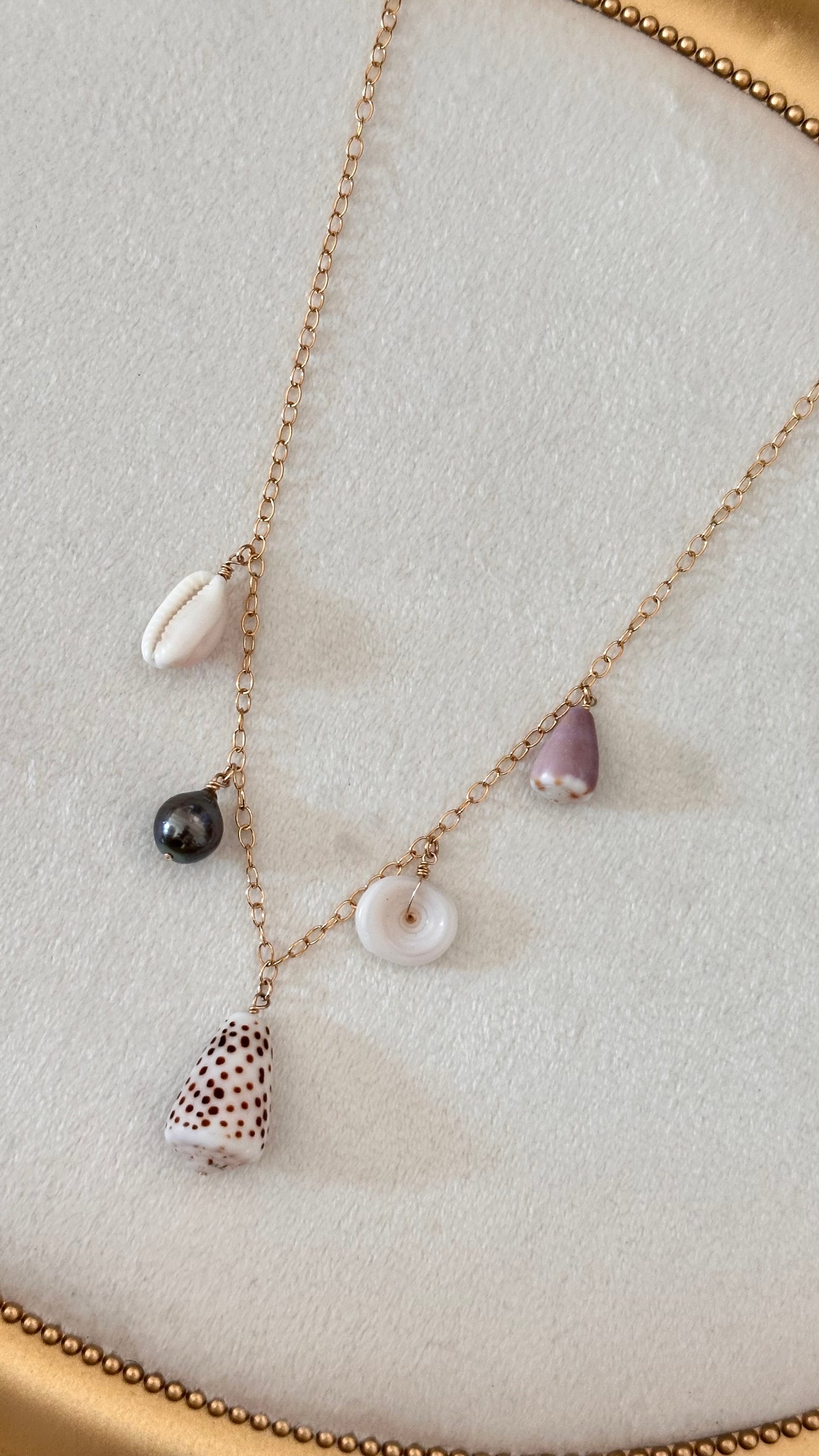A mix of shells handpicked in Hawai’i , Tahitian pearls & ocean inspired charms! Fun charm necklace of all things island living and ocean loving. Paired with 14kgoldfilled cable chain.