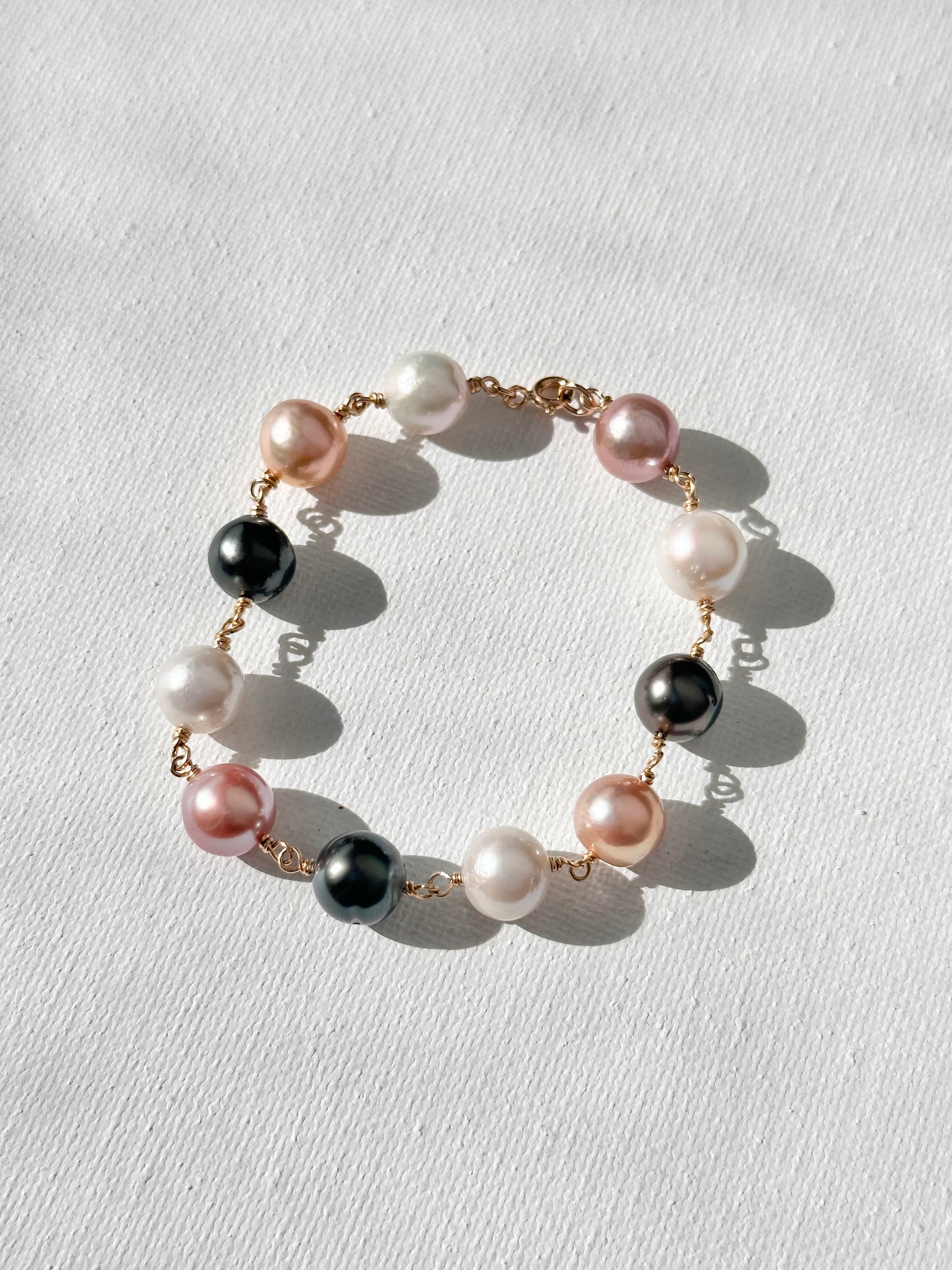 Sofia Bracelet: Experience luxury with this multi pearl bracelet. Made with tahitian pearls and white, pink, lavender and champagne pearl hues! Each pearl is wire-wrapped with 14k goldfilled wire, adding a touch of elegance to any outfit. Treat yourself or someone special to this unique piece!