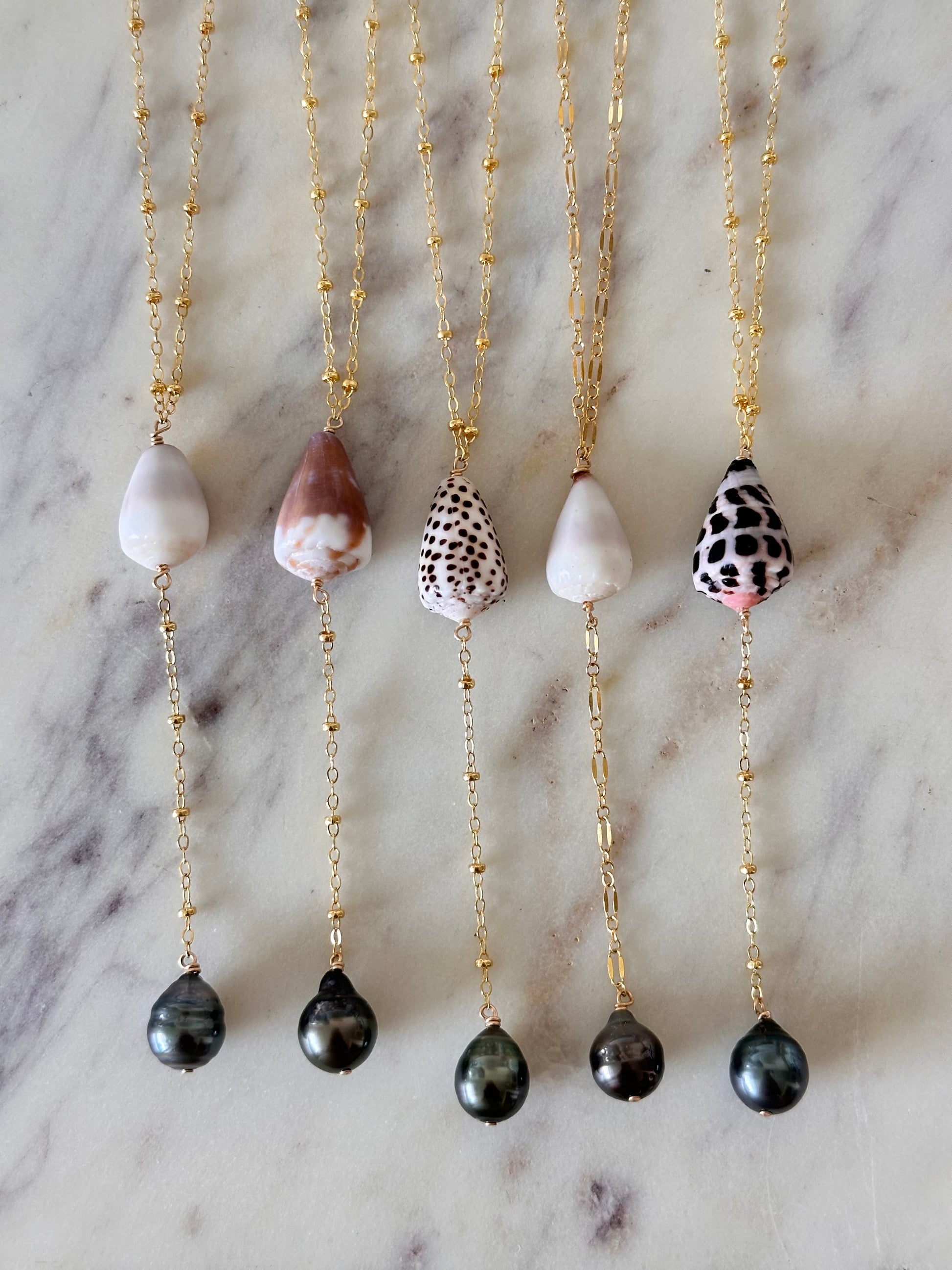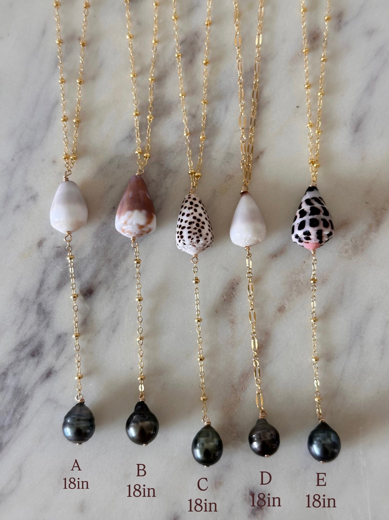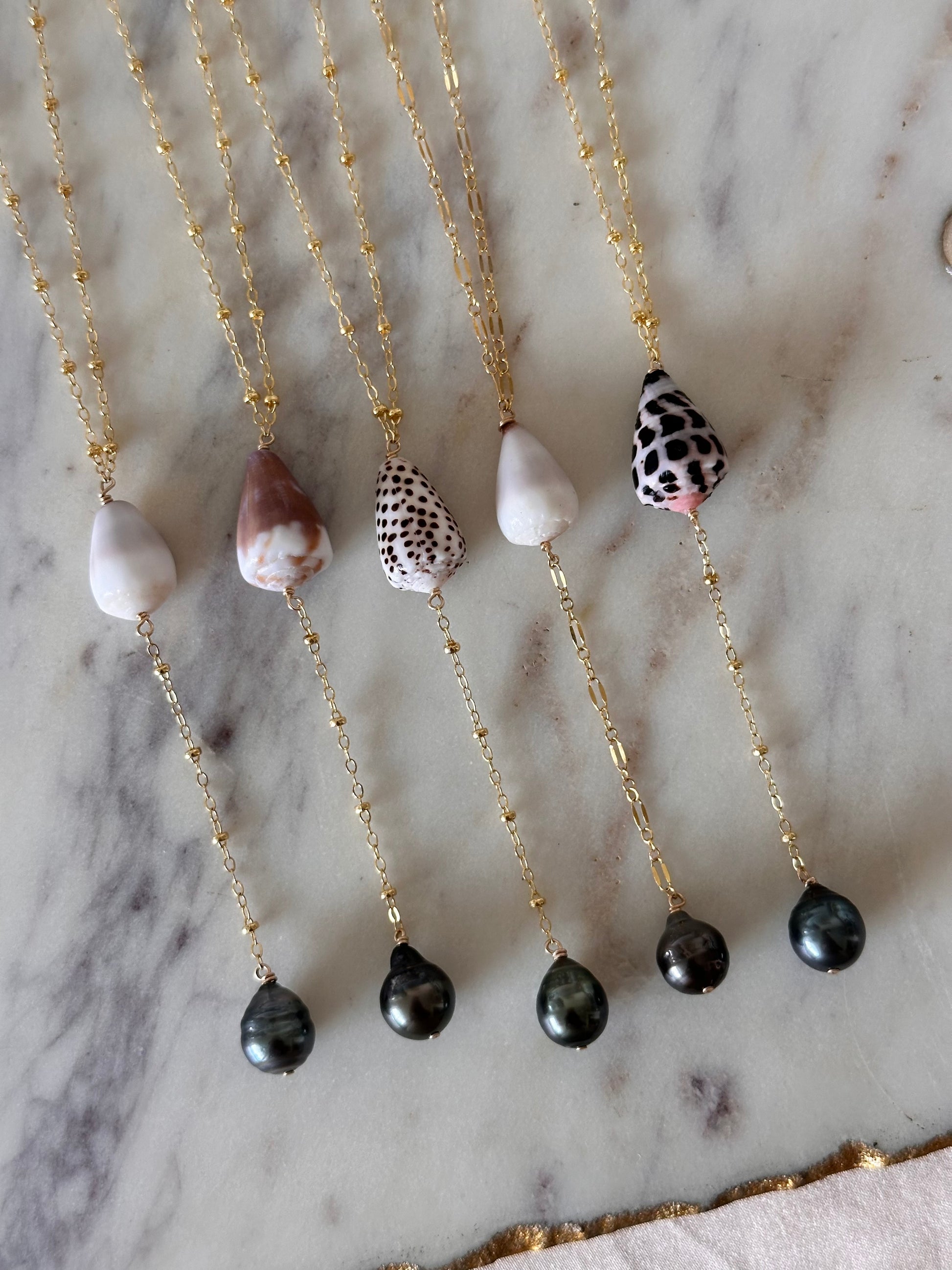 Our Coco Lariat necklace is handmade with 14k gold-filled chain, adorned with beautiful Hawaiian cone shell and a stunning 2-inch Tahitian pearl drop. This one-of-a-kind piece will add a touch of elegance and uniqueness to any look. Perfect for any occasion!