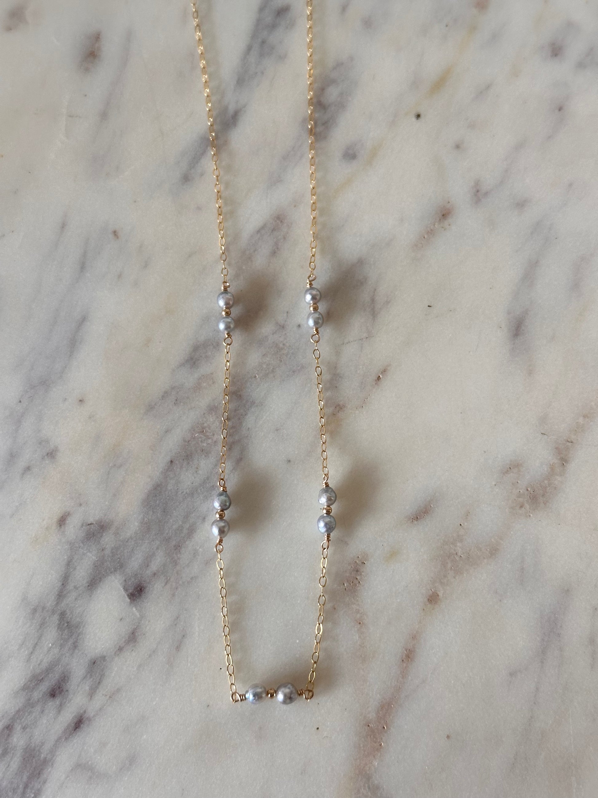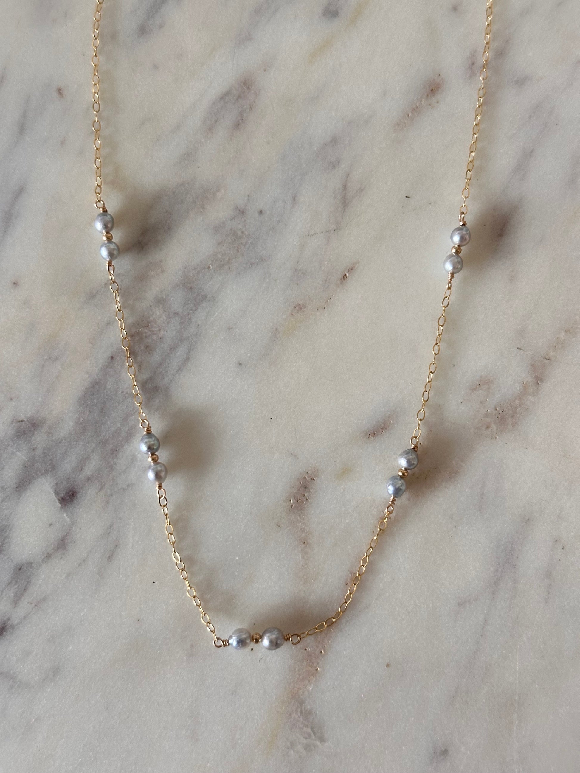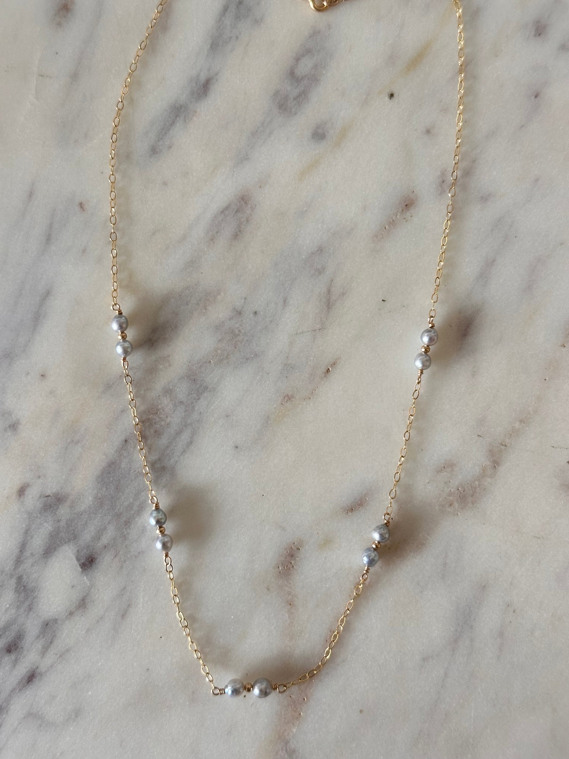 This dainty necklace features soft blue Akoya pearls spaced along a 14k gold-filled chain — lightweight, minimal, and full of quiet beauty. Each pearl is ocean-grown and perfectly imperfect, giving this necklace a natural glow that layers like a dream or stands on its own.