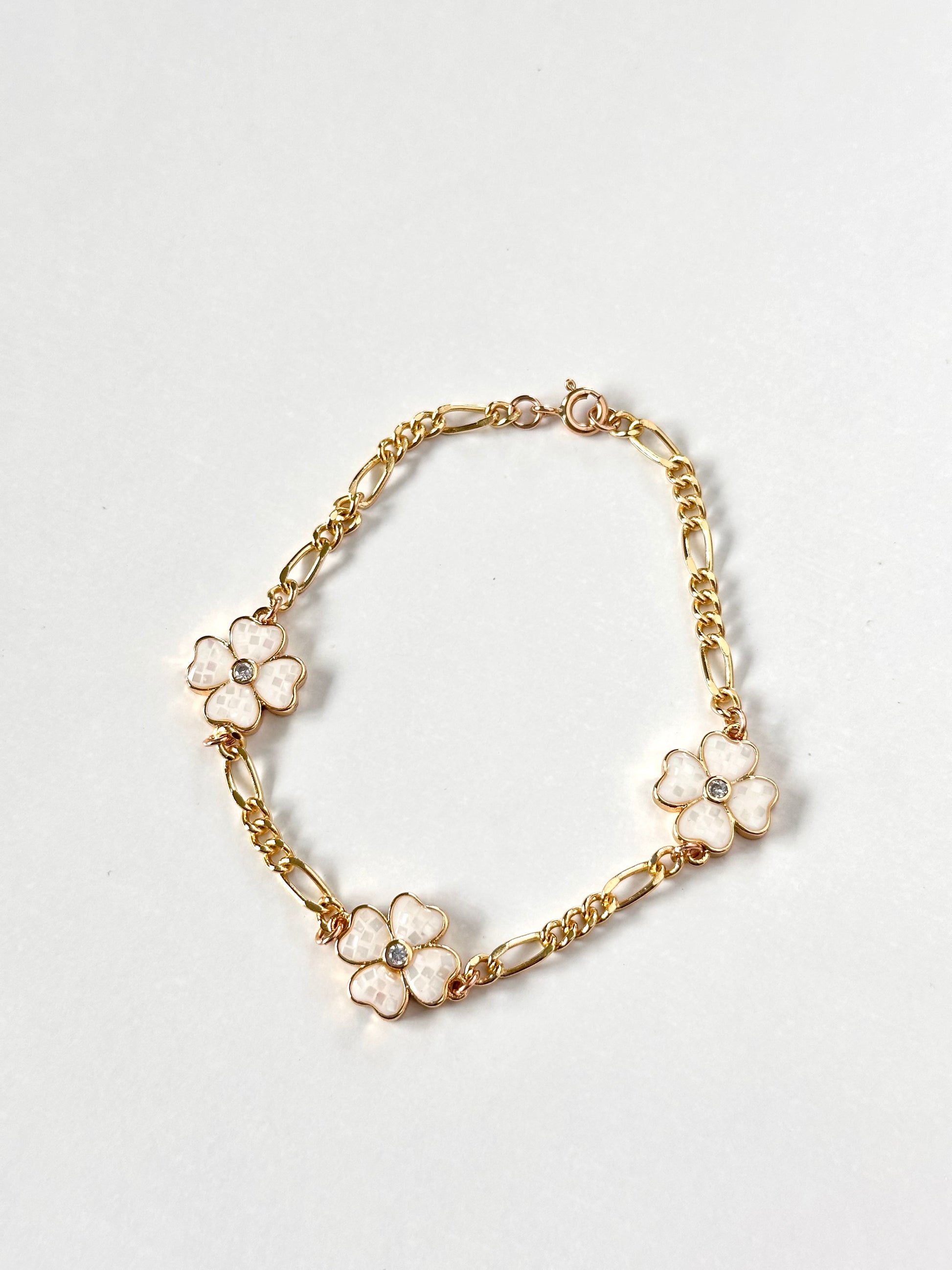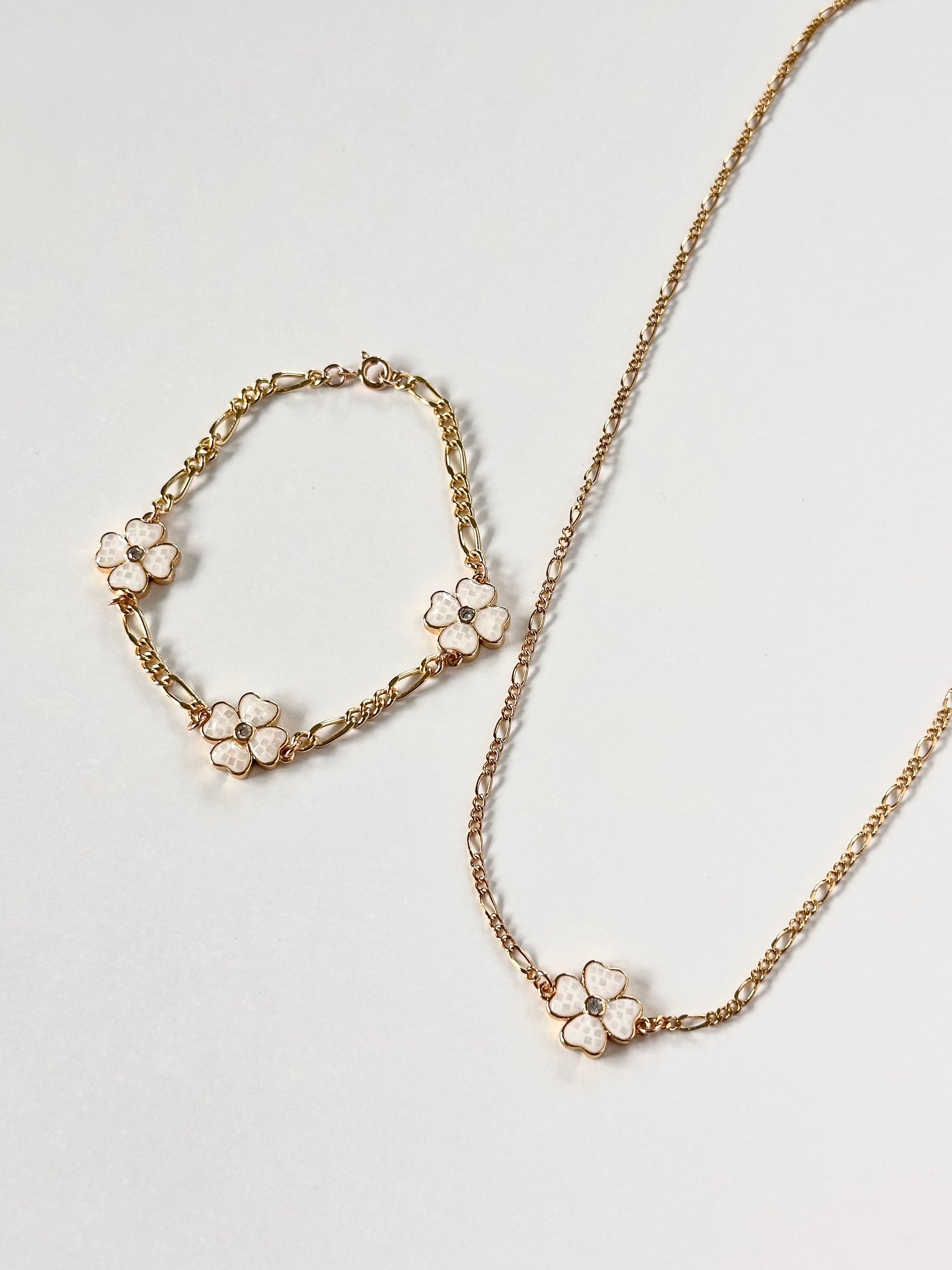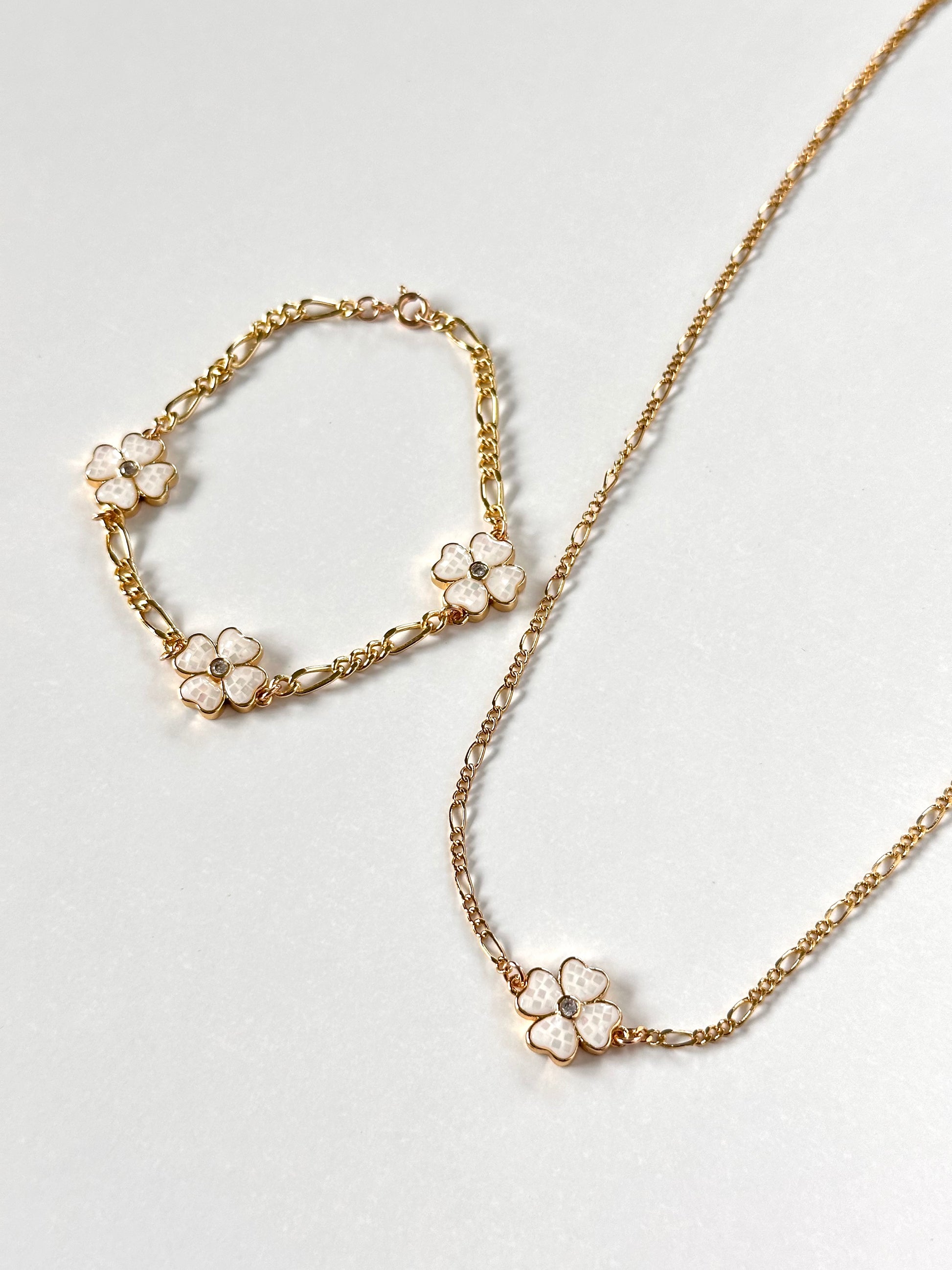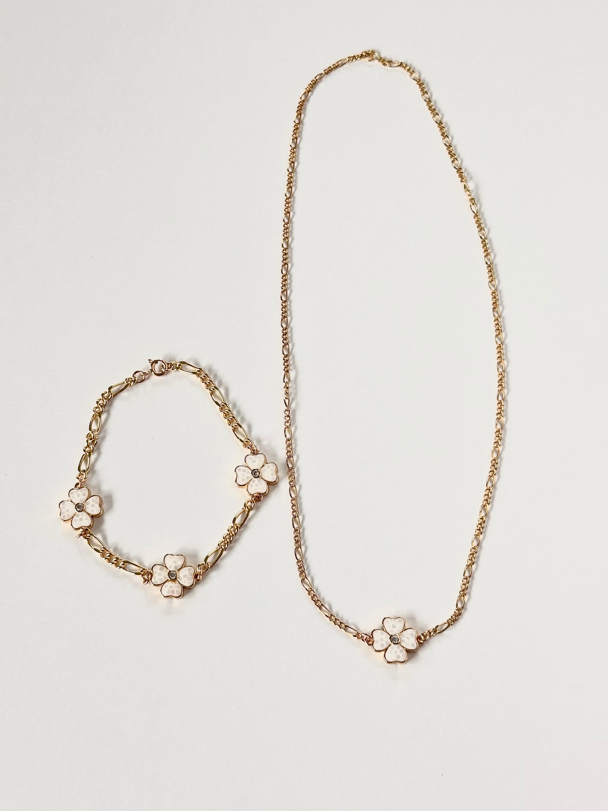 Elevate your style with the White Clover Necklace + Bracelet. Crafted with a delicate gold figaro chain, this versatile set features a white clover charm that adds a touch of elegance to any outfit. Whether worn together or separately, this set is sure to make a statement.